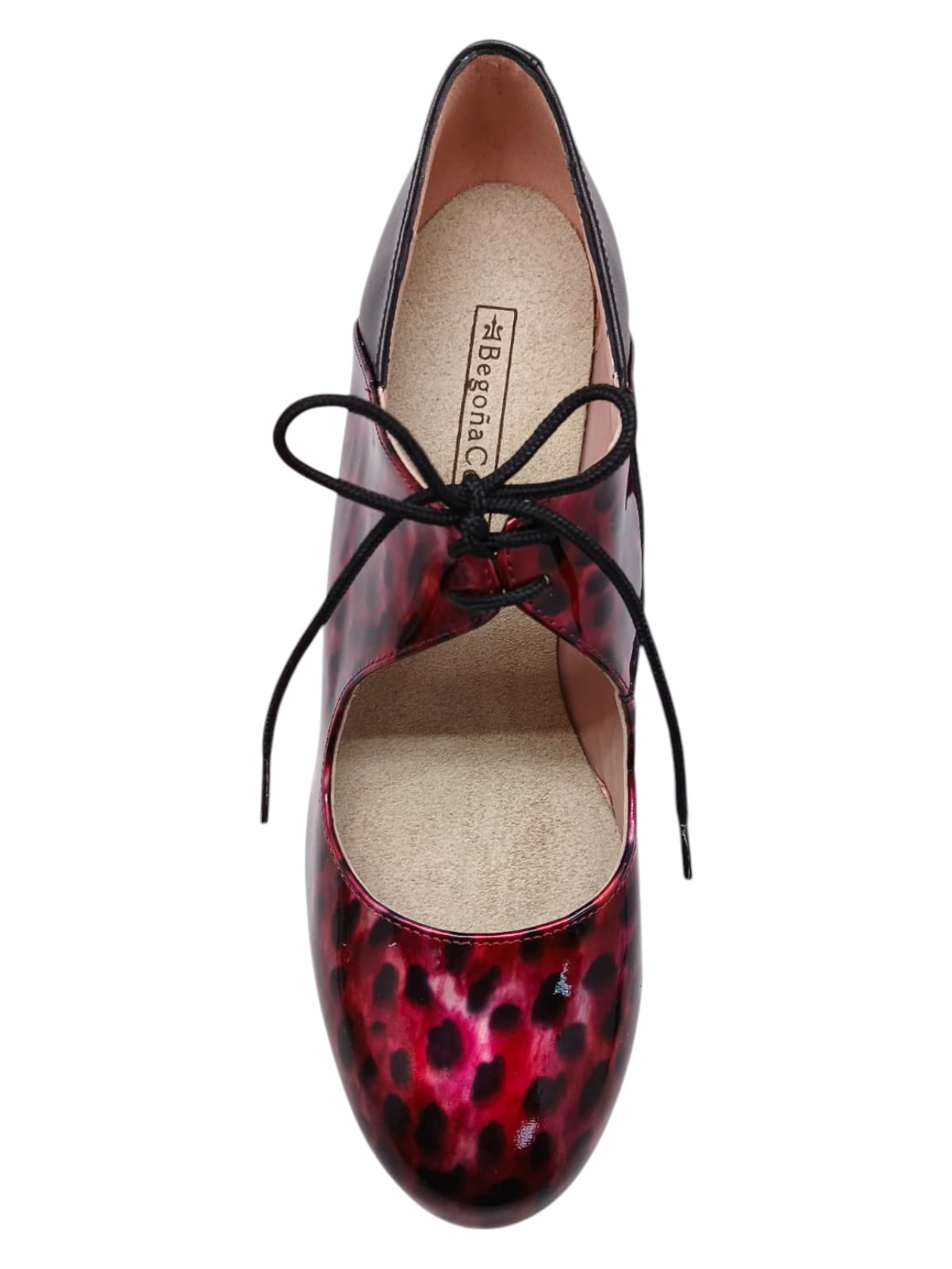 El Modelo Arty va abrochado en la parte de arriba del empeine con un cordón. Tiene planta de cuero, filis con acabado antideslizante, suela y planta de cuero cosidos a mano, clavos en puntera y tacón y forro de piel.