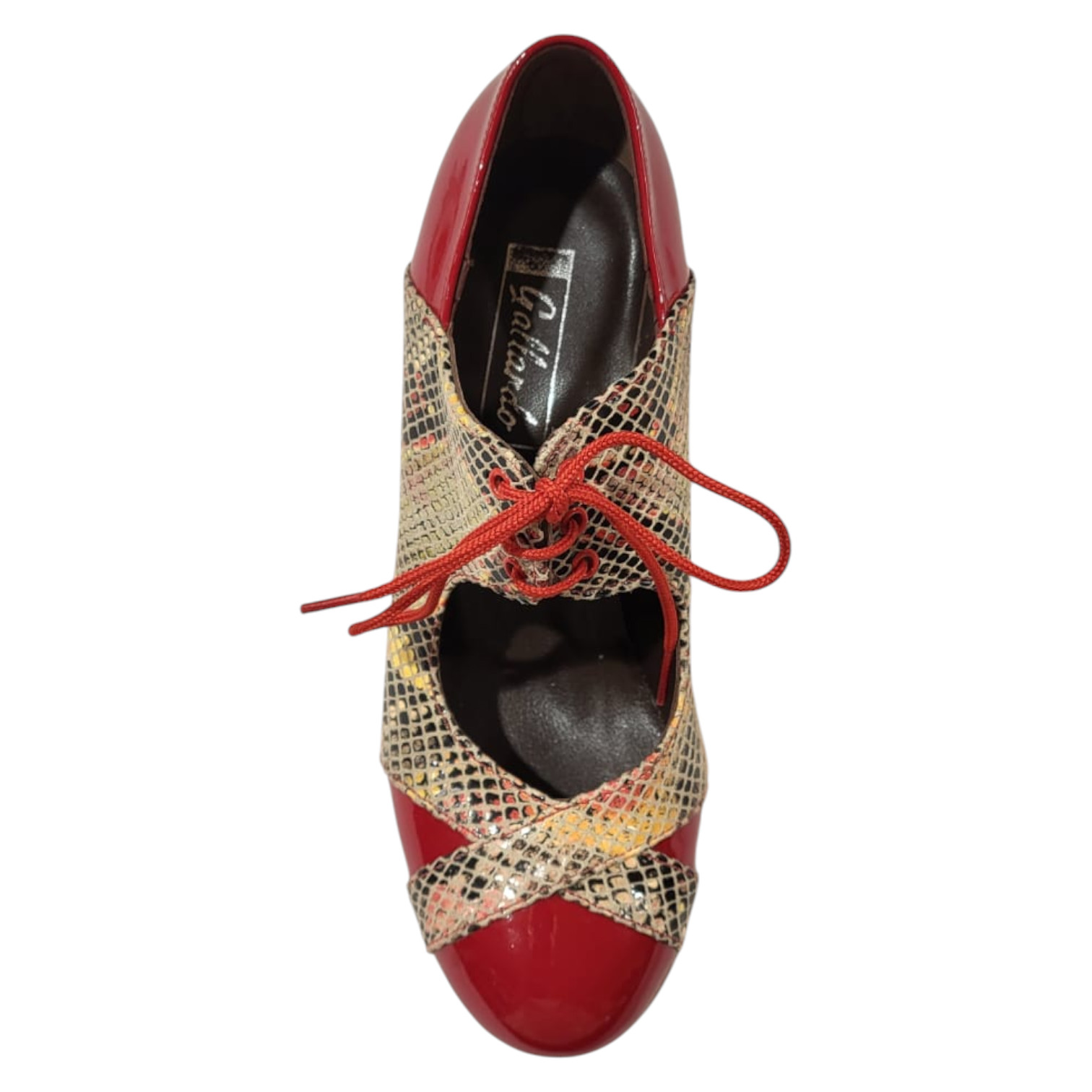 Variantes du modèle Yerbabuena A, les chaussures montantes de flamenco à lacets sur l’empeigne ont un design original divisé en plusieurs pièces pour permettre la combinaison de différents matériaux. Fabriquées en cuir de vachette de première qualité, les chaussures sont pourvues de patins antiglisse (filis) et de nombreux clous sur la pointe et le talon. Elles peuvent être fabriquées avec une semelle standard (série A) ou spéciale (série P - professionnelle).