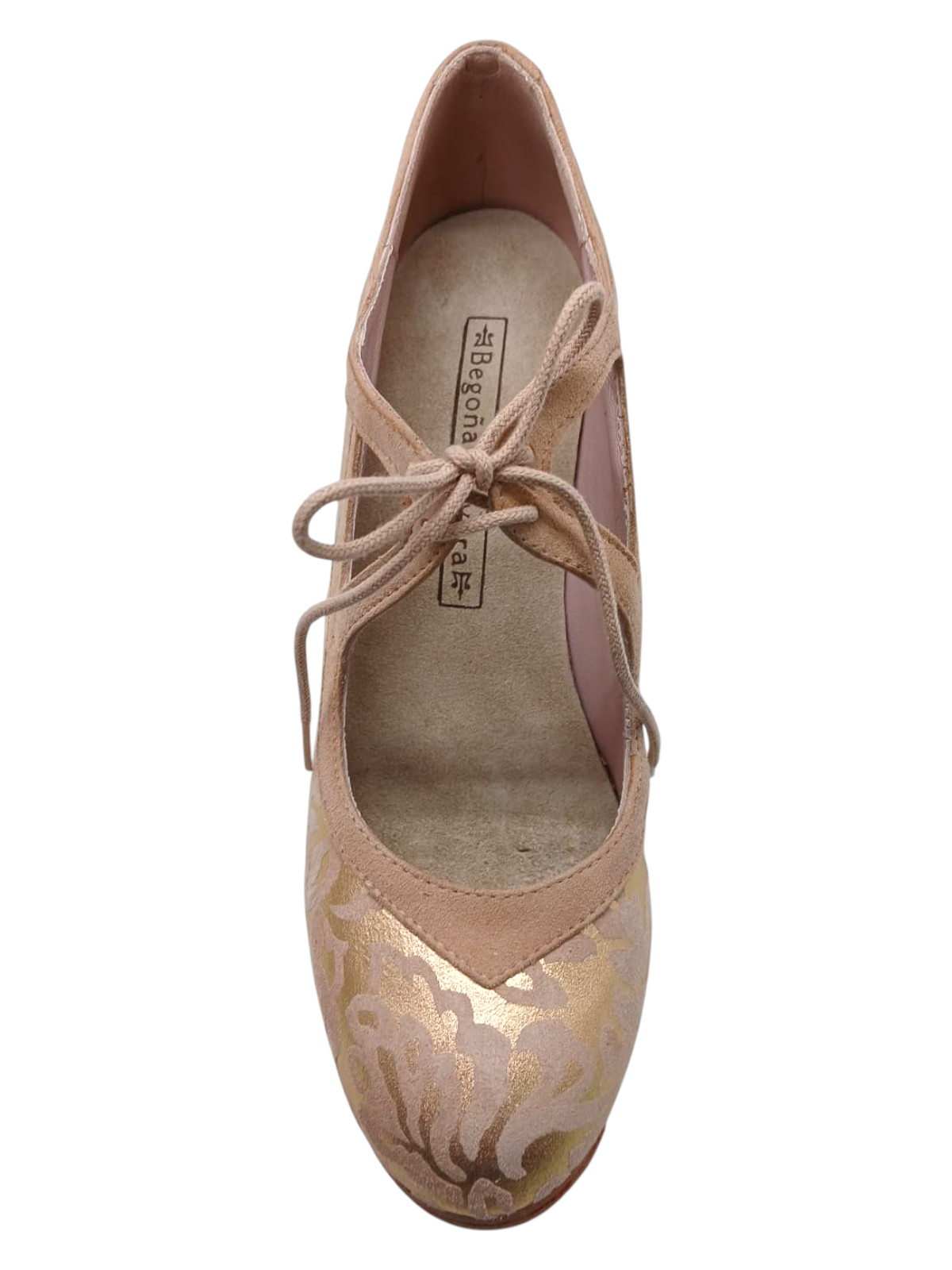Modelo Candor. Elegante zapato para baile flamenco, bicolor. Tiene planta de cuero, filis con acabado antideslizante, suela y planta de cuero cosidos a mano, clavos en puntera y tacón y forro de piel.