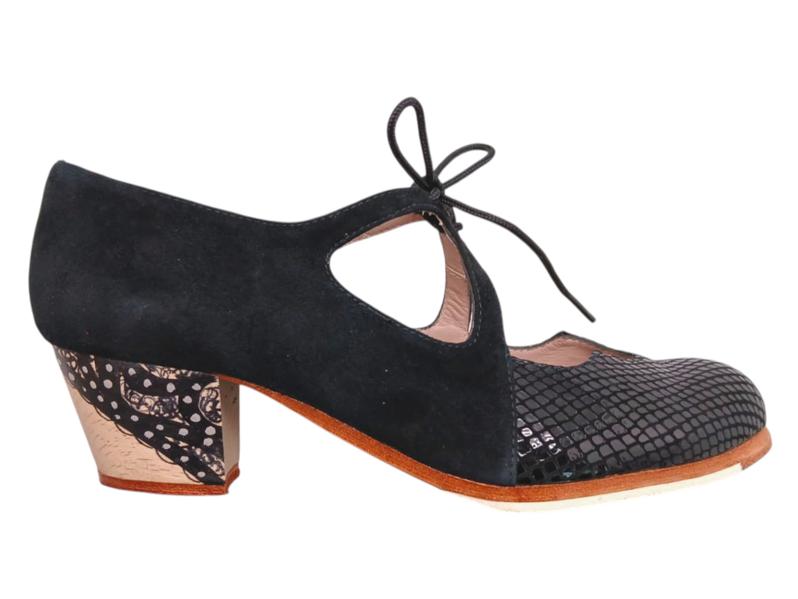 El Modelo Dulce es un zapato para baile flamenco elegante, que dentro de su sencillez tiene un diseño muy original. Tiene planta de cuero, filis con acabado antideslizante, suela y planta de cuero cosidos a mano, clavos en puntera y tacón y forro de piel.