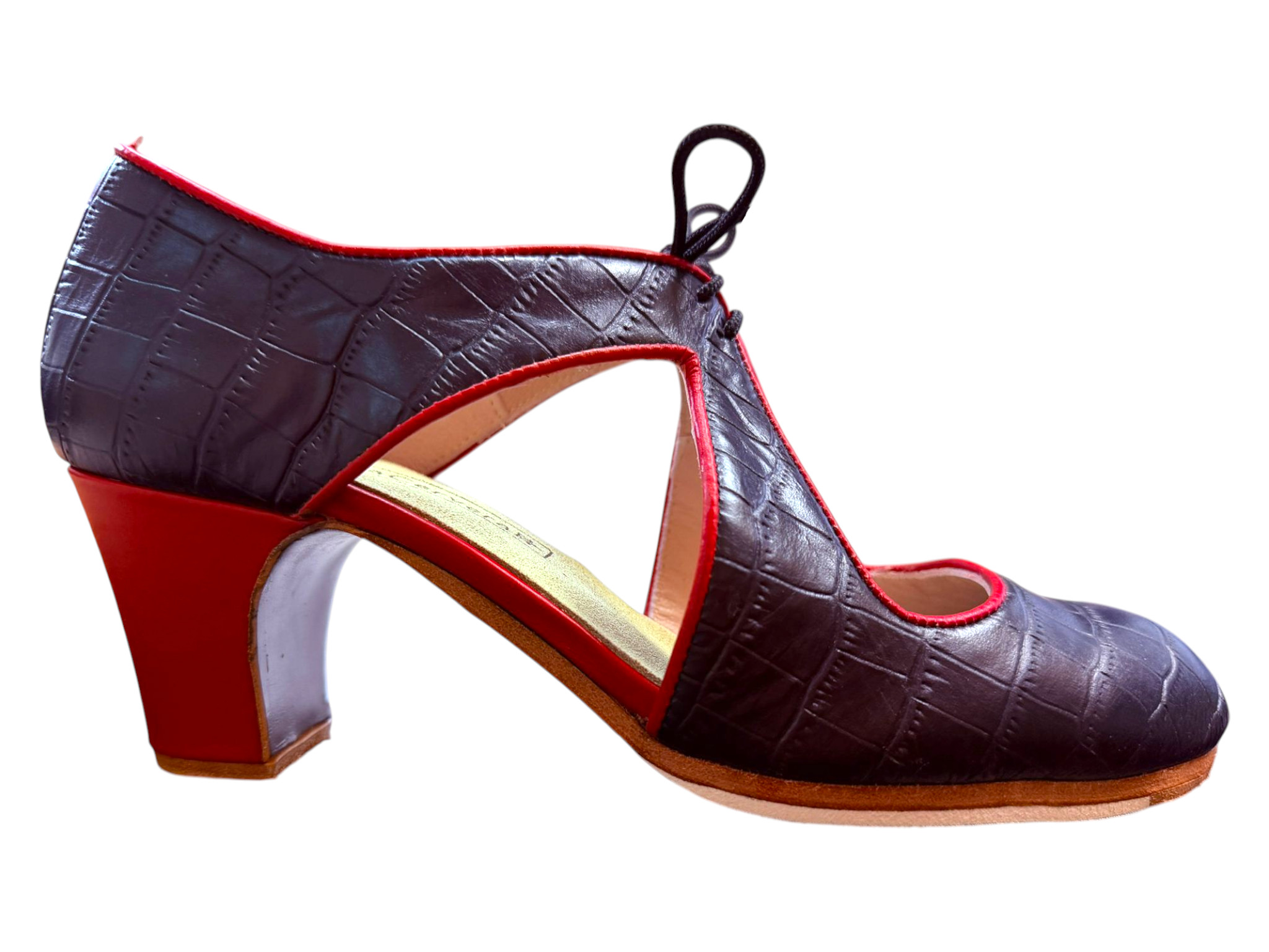 El zapato profesional Begoña Cervera Modelo Escote tiene un diseño espectacular. Va abrochado y anudado en la parte de arriba, y deja el pie al descubierto entre la puntera y el talón. Tiene planta de cuero, filis con acabado antideslizante, suela y planta de cuero cosidos a mano, clavos en puntera y tacón y forro de piel.