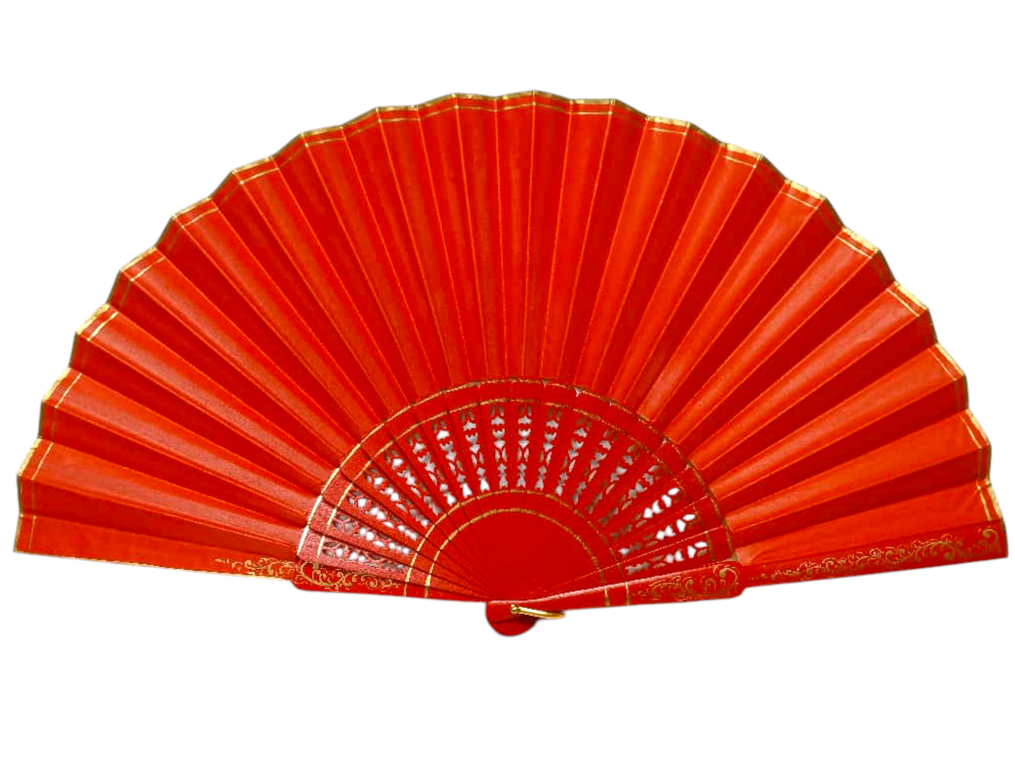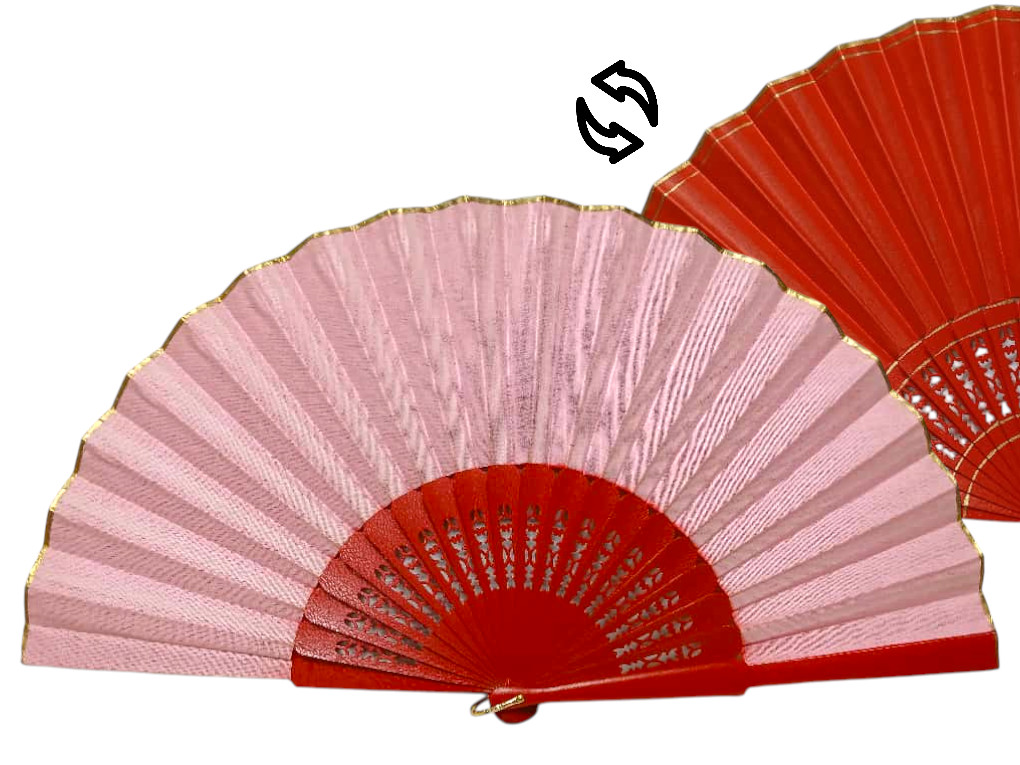 Fabricado en tela y varillas de madera caladas con detalles dorados, este modelo destaca por su acabado cuidado y su espectacular presencia escénica. Además, incluye una anilla metálica en el extremo, ideal para colgarlo o transportarlo fácilmente, un detalle práctico muy valorado por bailarinas y profesores de academias.
