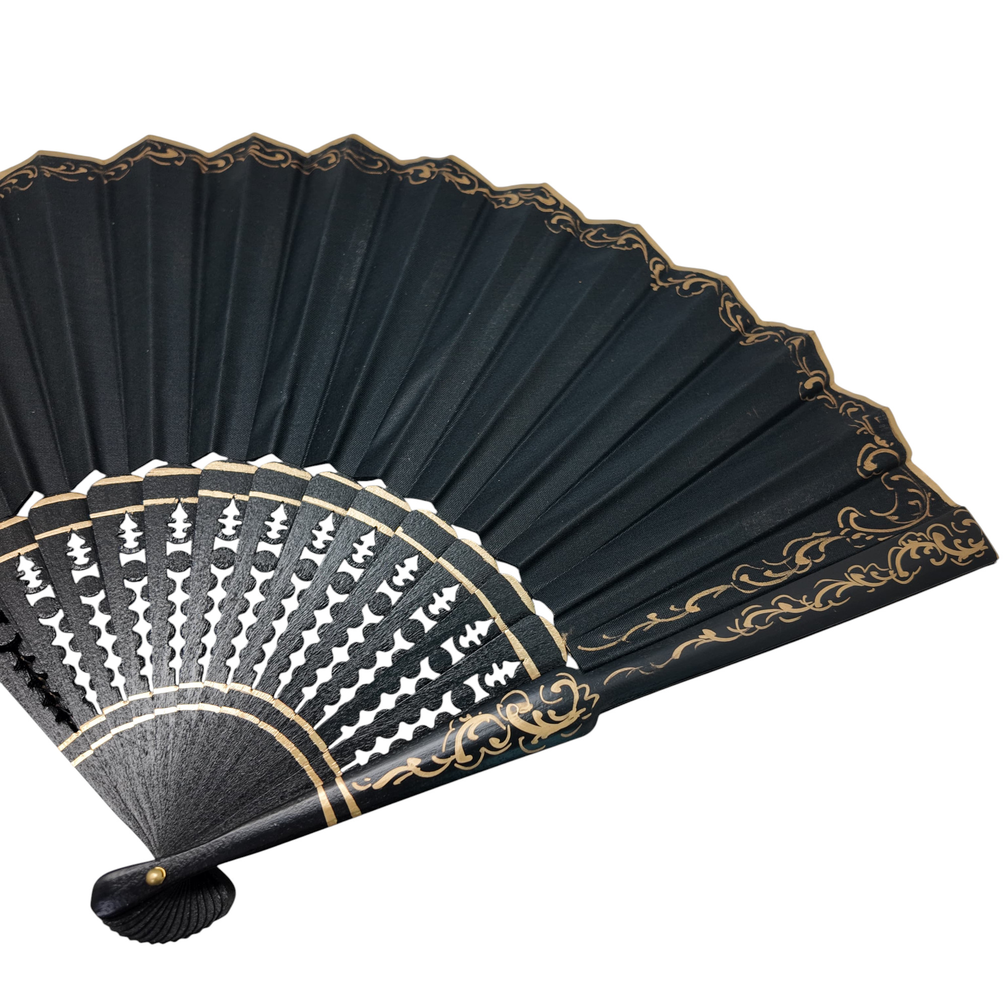Fabricado en tela con varillas de madera caladas y decoradas, este modelo cuenta con un refuerzo especial de doble tela, lo que significa que está forrado por ambas caras, ocultando las varillas en el interior y aportando una mayor robustez, estabilidad y durabilidad durante el uso.
