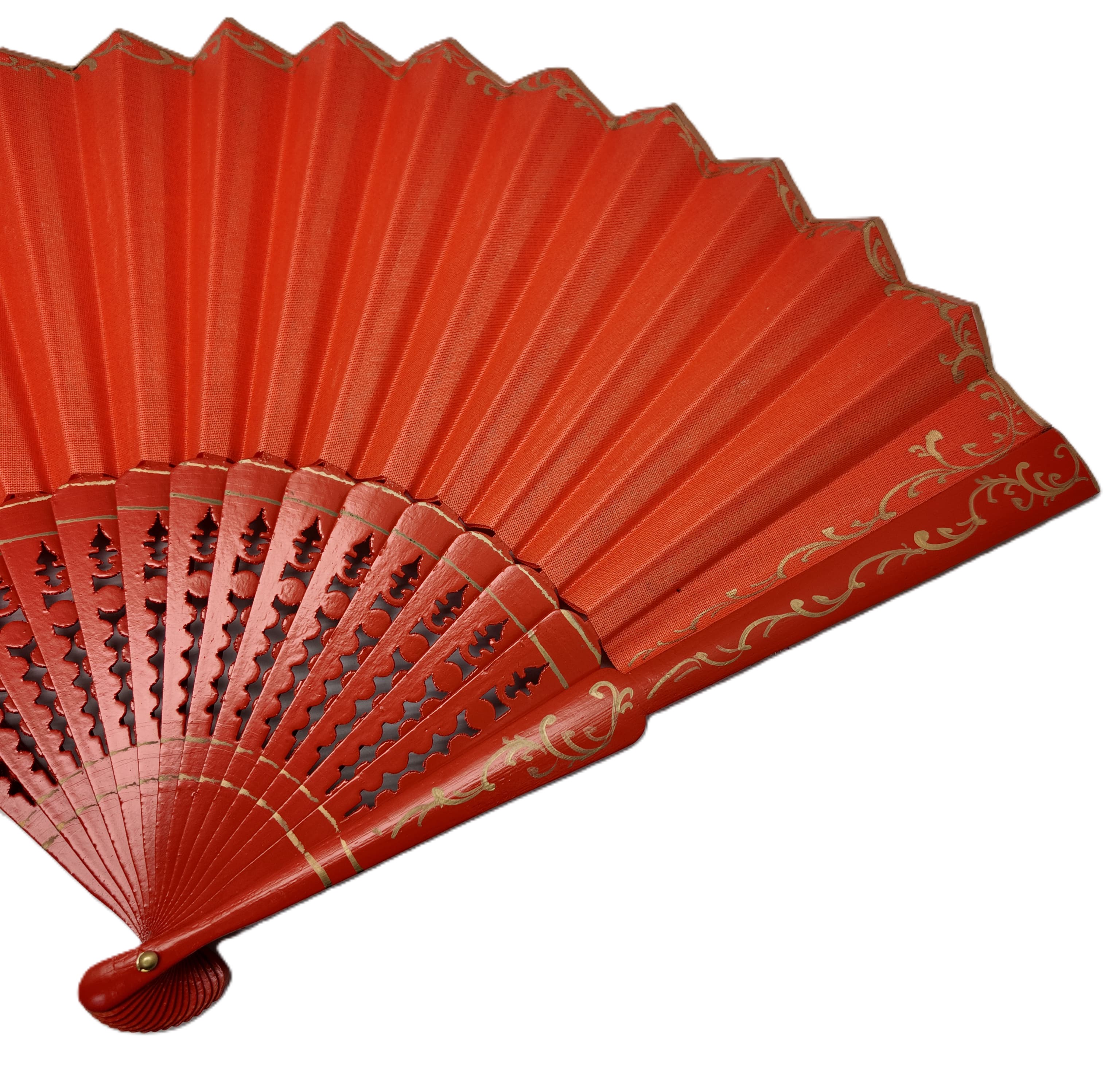 Fabricado en tela con varillas de madera caladas y decoradas, este modelo cuenta con un refuerzo especial de doble tela, lo que significa que está forrado por ambas caras, ocultando las varillas en el interior y aportando una mayor robustez, estabilidad y durabilidad durante el uso.