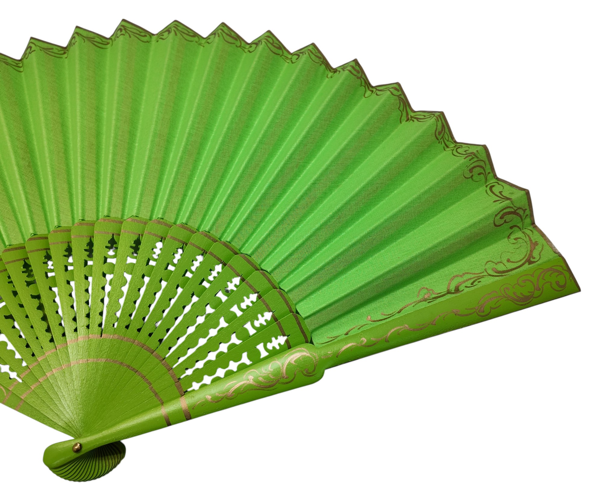 Fabricado en tela con varillas de madera caladas y decoradas, este modelo cuenta con un refuerzo especial de doble tela, lo que significa que está forrado por ambas caras, ocultando las varillas en el interior y aportando una mayor robustez, estabilidad y durabilidad durante el uso.