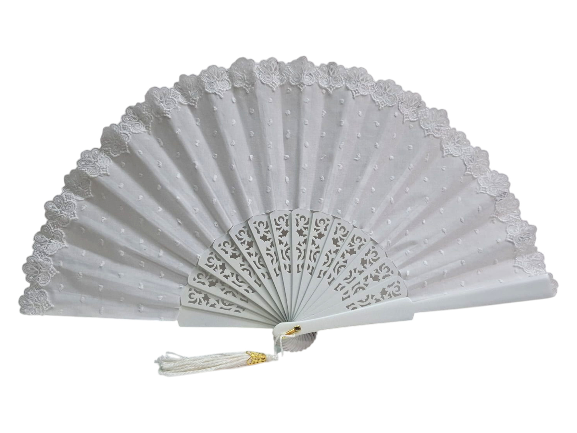 Este abanico de novia de madera calada en color blanco con delicada puntilla es el complemento perfecto para un look nupcial romántico y sofisticado. Su diseño combina varillas de madera finamente talladas con un tejido ligero decorado con detalles de puntilla, aportando frescura y estilo en bodas, ceremonias y sesiones fotográficas. Ligero, resistente y fácil de llevar, este abanico es ideal para novias que buscan un accesorio clásico, elegante y atemporal. Añade un toque de distinción a tu vestido de novia con este abanico blanco calado, perfecto también como regalo o detalle para invitadas.