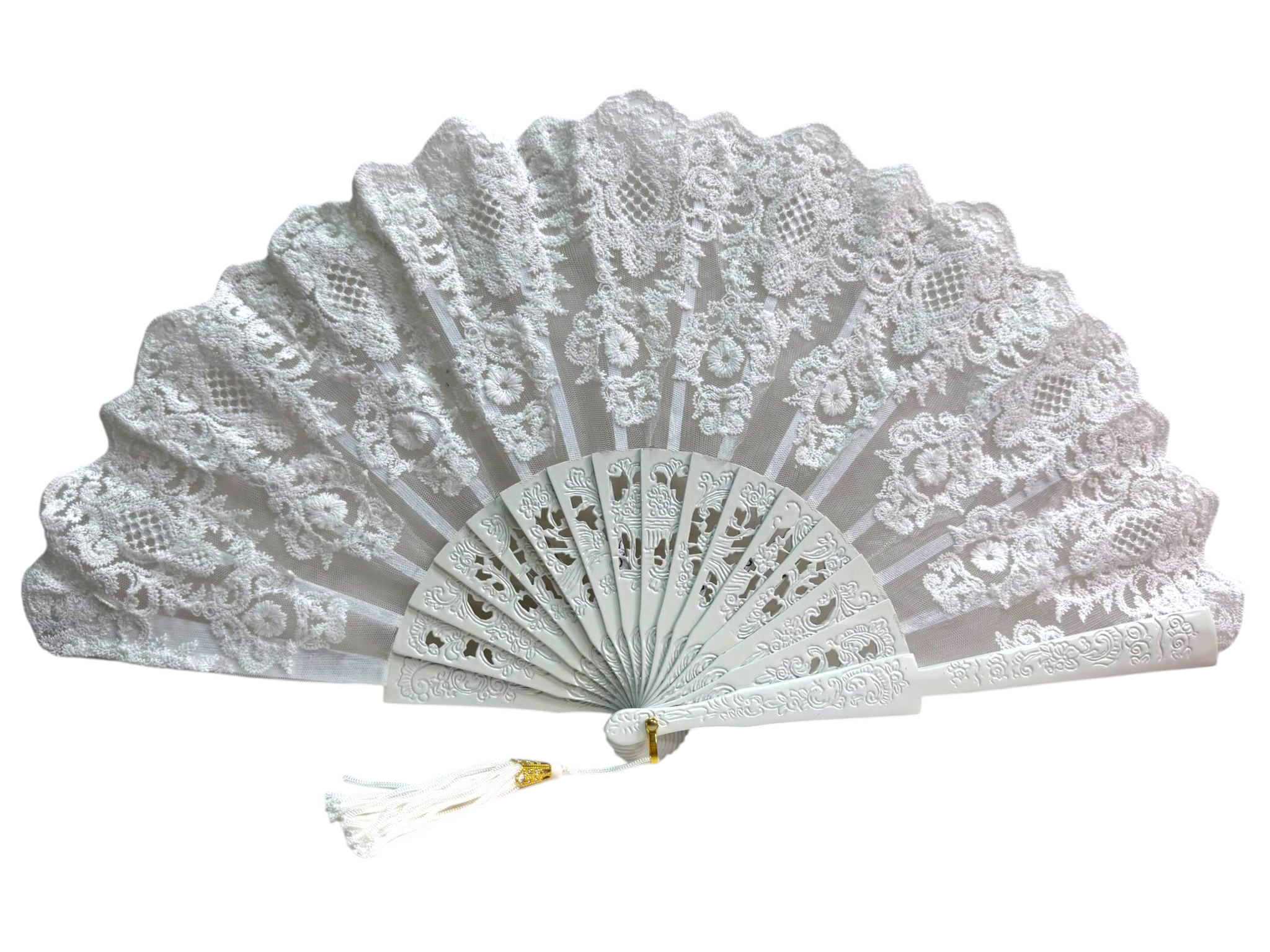 Abanico de novia de madera grabada color marfil con encaje elegante. Complemento nupcial vintage