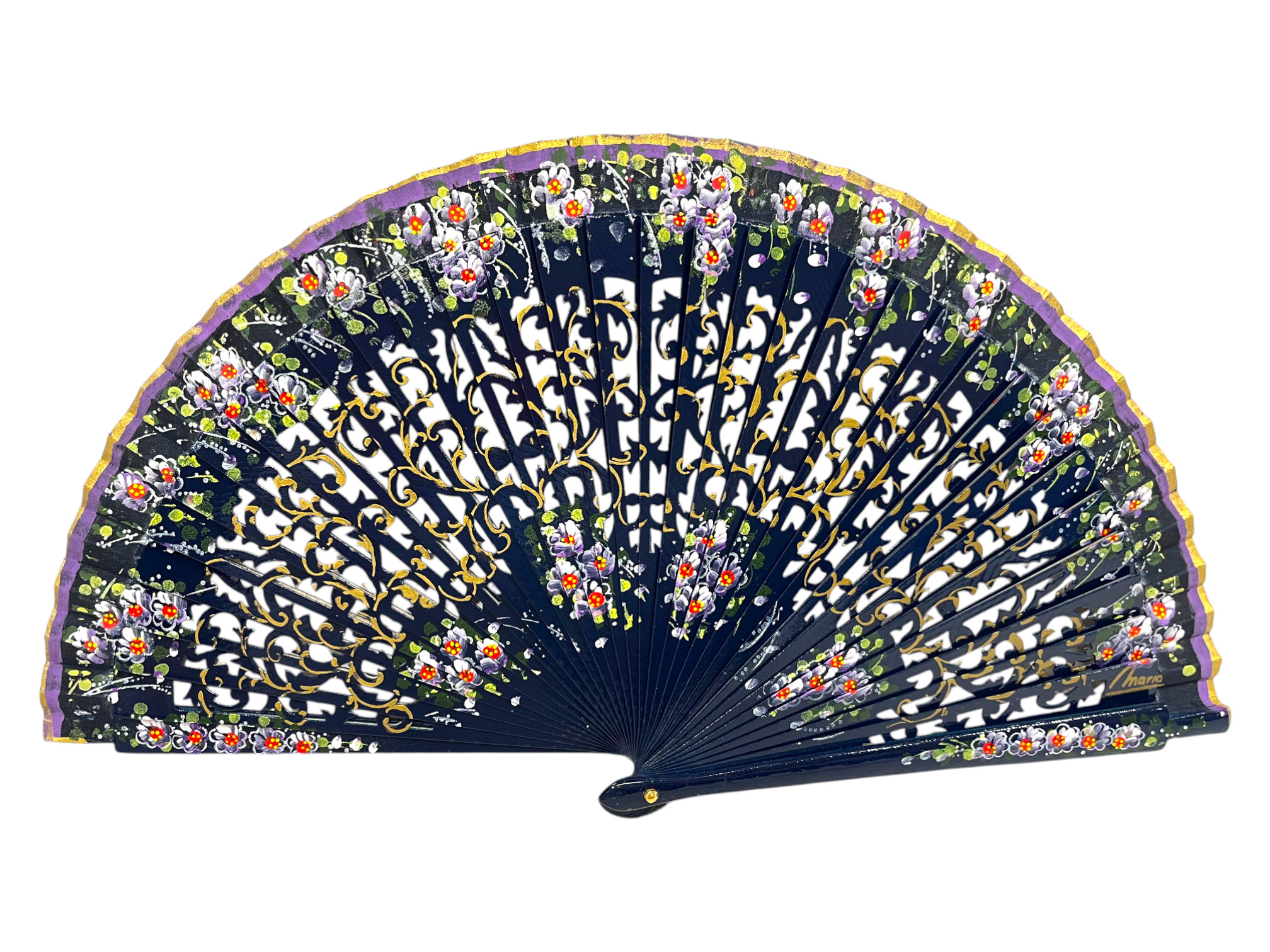 Abanico pintado por las dos caras con motivos florales. Es un abanico de madera calada.