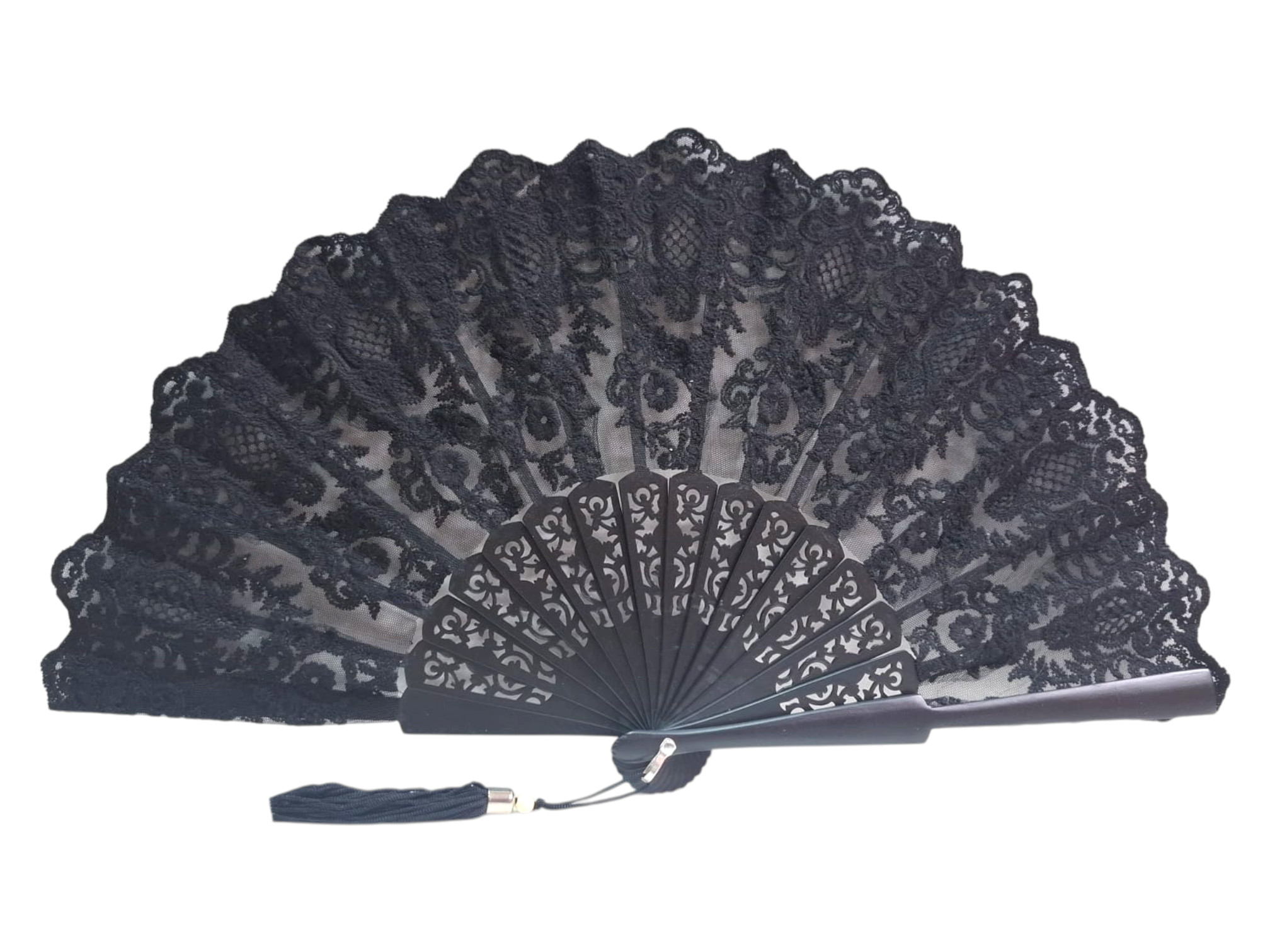 Descubre este abanico de ceremonia negro con encaje delicado y varillas de madera caladas. Un abanico elegante perfecto para bodas, eventos y celebraciones. Diseñado para invitadas y madrinas que buscan un complemento sofisticado. Fabricado en España e incluye borla decorativa para un acabado impecable.