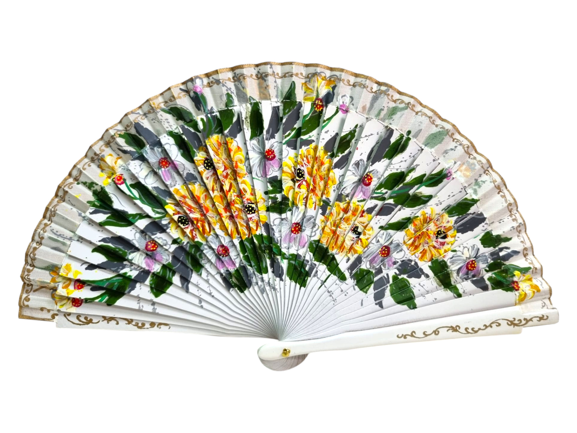Este encantador abanico de 19 cm, elaborado en madera de sicomoro, destaca por su frescura y luminosidad gracias a su diseño floral pintado completamente a mano. Sobre un fondo blanco con suaves matices grises, se distribuyen flores amarillas, blancas y detalles en rosa, creando un conjunto alegre, primaveral y muy elegante.
