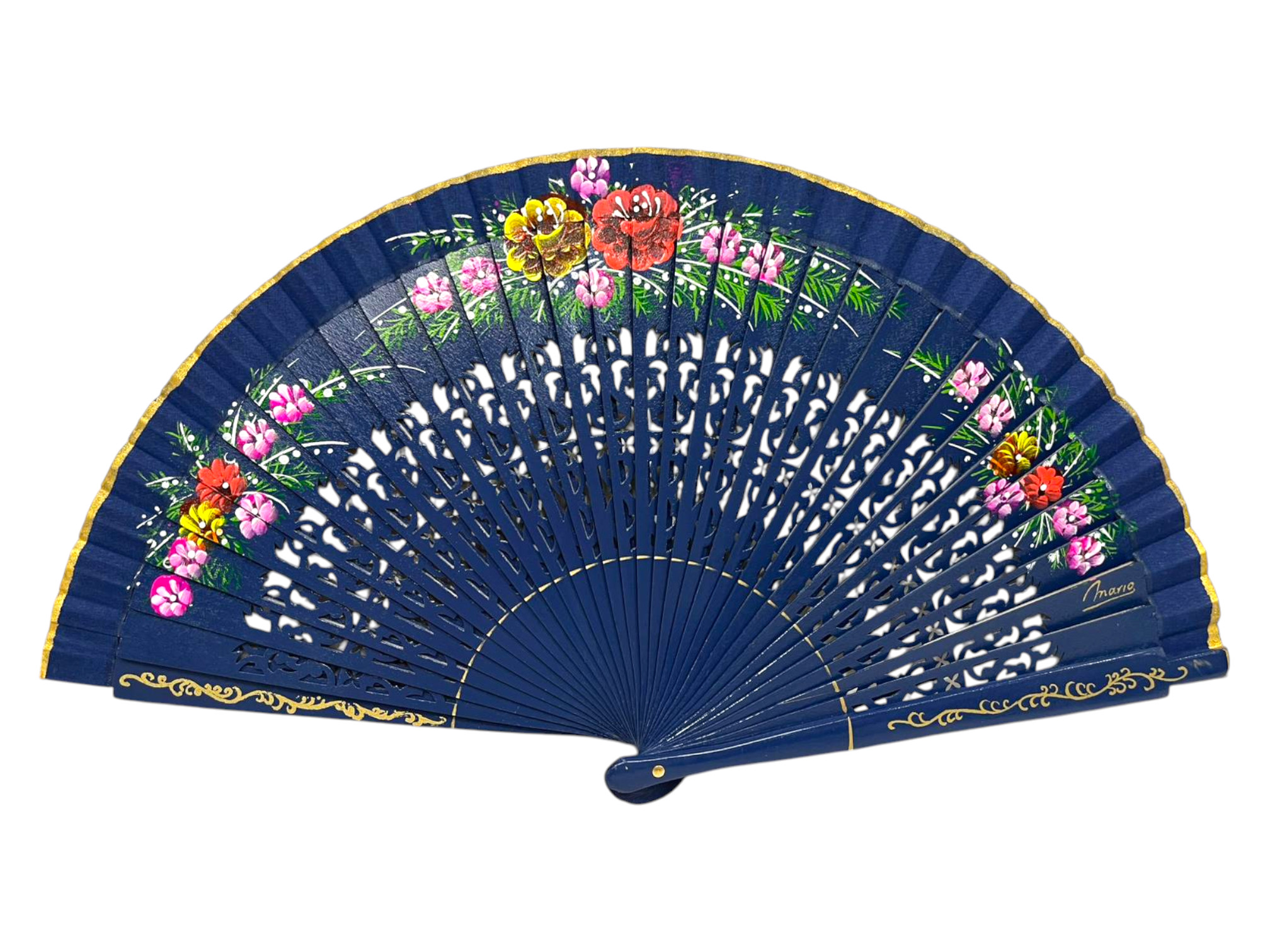 Abanico pintado por las dos caras con motivos florales. Es un abanico de madera calada.