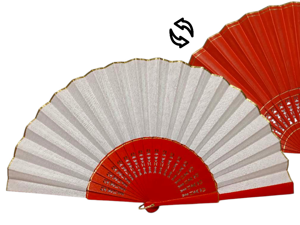 Este abanico pericón bicolor es una pieza original, elegante y muy característica dentro del mundo del baile flamenco profesional. Su diseño combina la intensidad del color rojo, presente siempre en una de las caras, con una segunda cara disponible en distintos colores a elegir, creando un efecto visual único y lleno de contraste en el movimiento.