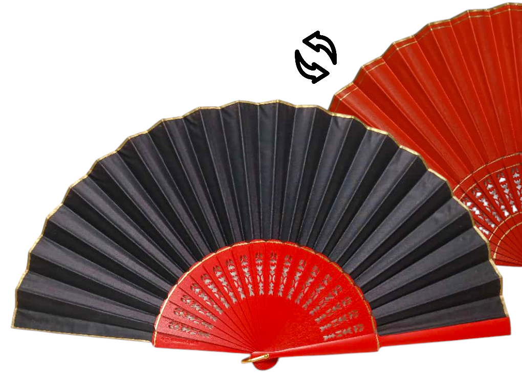 Fabricado en tela y varillas de madera caladas con detalles dorados, este modelo destaca por su acabado cuidado y su espectacular presencia escénica. Además, incluye una anilla metálica en el extremo, ideal para colgarlo o transportarlo fácilmente, un detalle práctico muy valorado por bailarinas y profesores de academias.