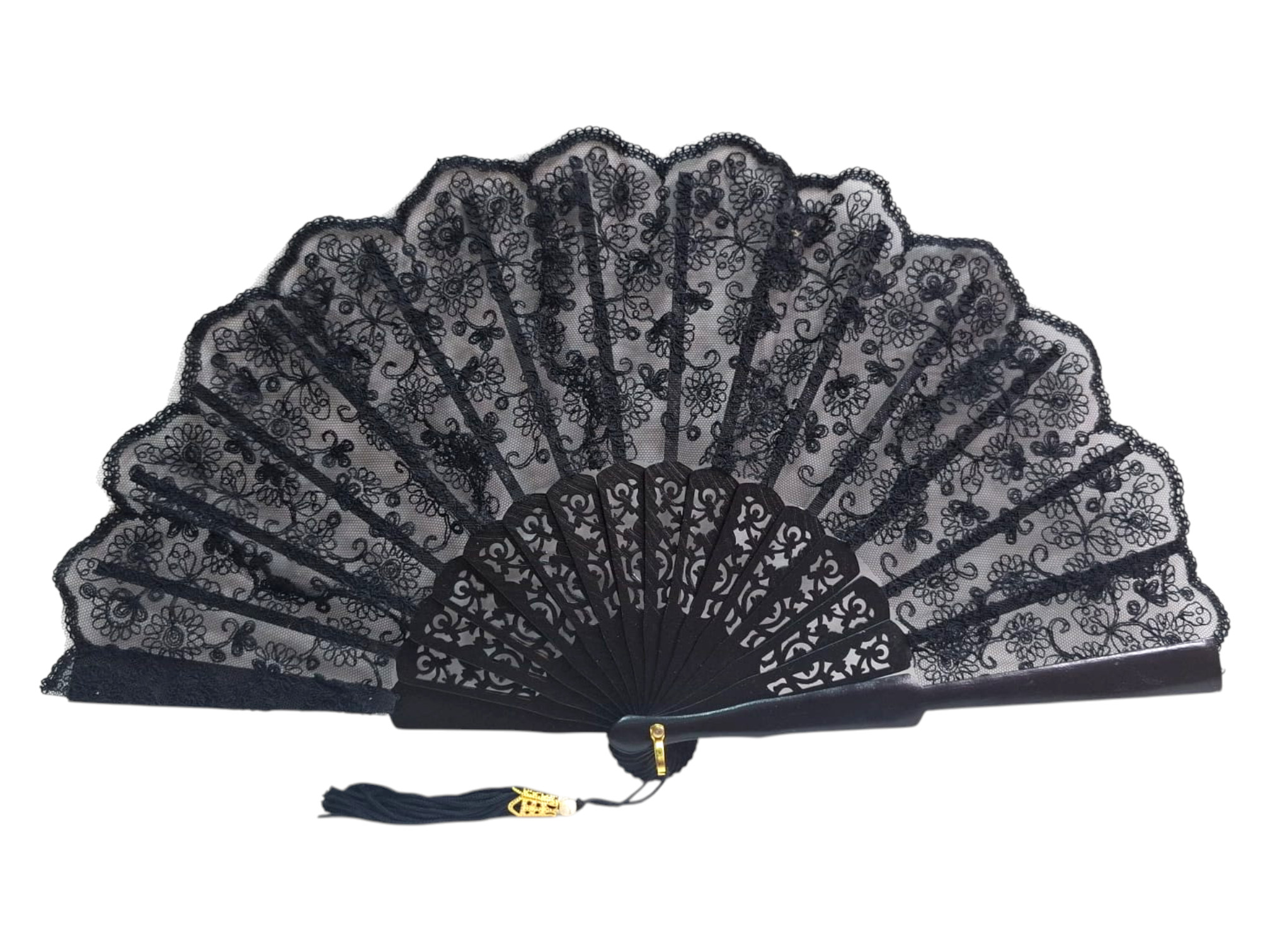 Abanico negro de encaje (blonda) con varillas de madera caladas, ideal como abanico elegante para boda, invitadas y madrinas. Este abanico de ceremonia, fabricado en España, aporta distinción a cualquier look de fiesta. Incluye borla decorativa para un acabado sofisticado. Perfecto para combinar con vestidos largos y trajes de evento.