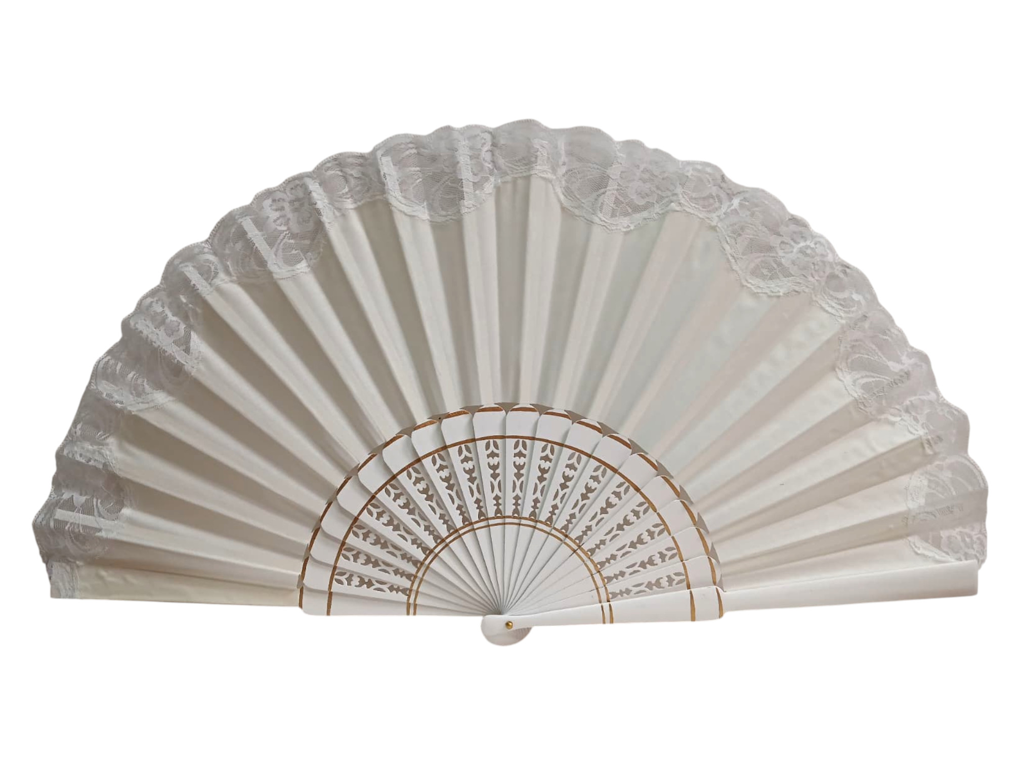 El abanico pericón con encaje y varillas caladas en blanco es una pieza elegante, clásica y muy representativa del estilo flamenco español. Su diseño combina la delicadeza del encaje blanco con la luminosidad de las varillas caladas decoradas en dorado, creando un efecto armonioso y refinado que destaca tanto en el escenario como en cualquier ocasión especial.