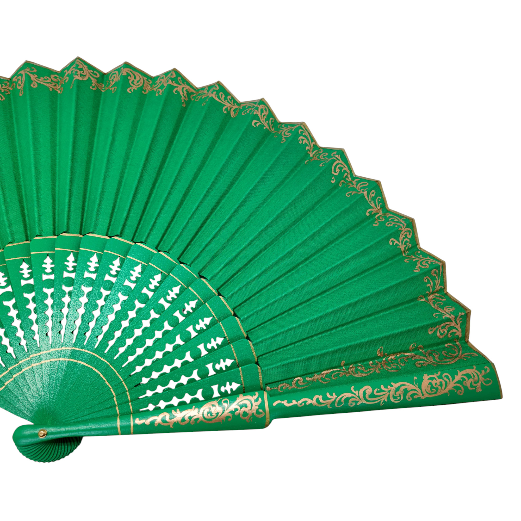 El abanico pericón flamenco decorado es una pieza espectacular que combina elegancia, resistencia y presencia escénica. Su diseño liso destaca por los adornos dorados pintados a mano tanto en las varillas como en el borde de la tela, aportando un brillo refinado y distinguido que lo convierte en un abanico realmente único.