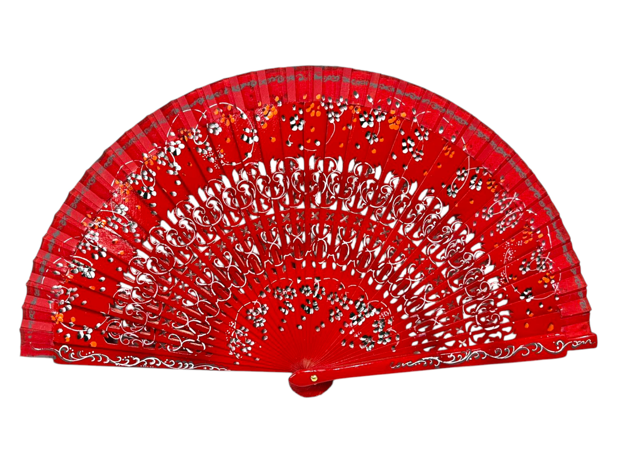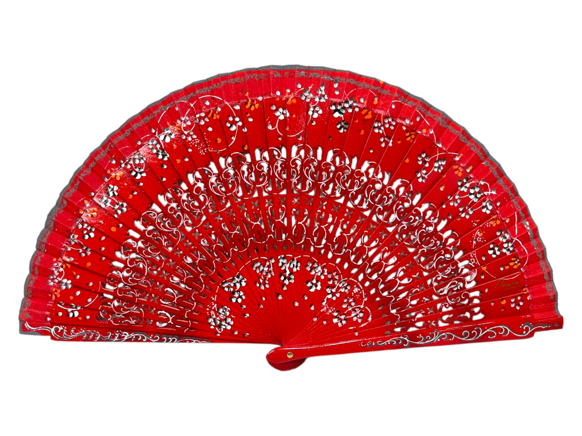 Abanico floral de madera con diseño calado y pintura artesanal en ambas caras. Este abanico español destaca por su ligereza y estilo tradicional, ideal para regalar o utilizar en verano, bodas o celebraciones. Elegante abanico floral con fondo rojo y diseño calado y pintura artesanal. Ideal como complemento o regalo.