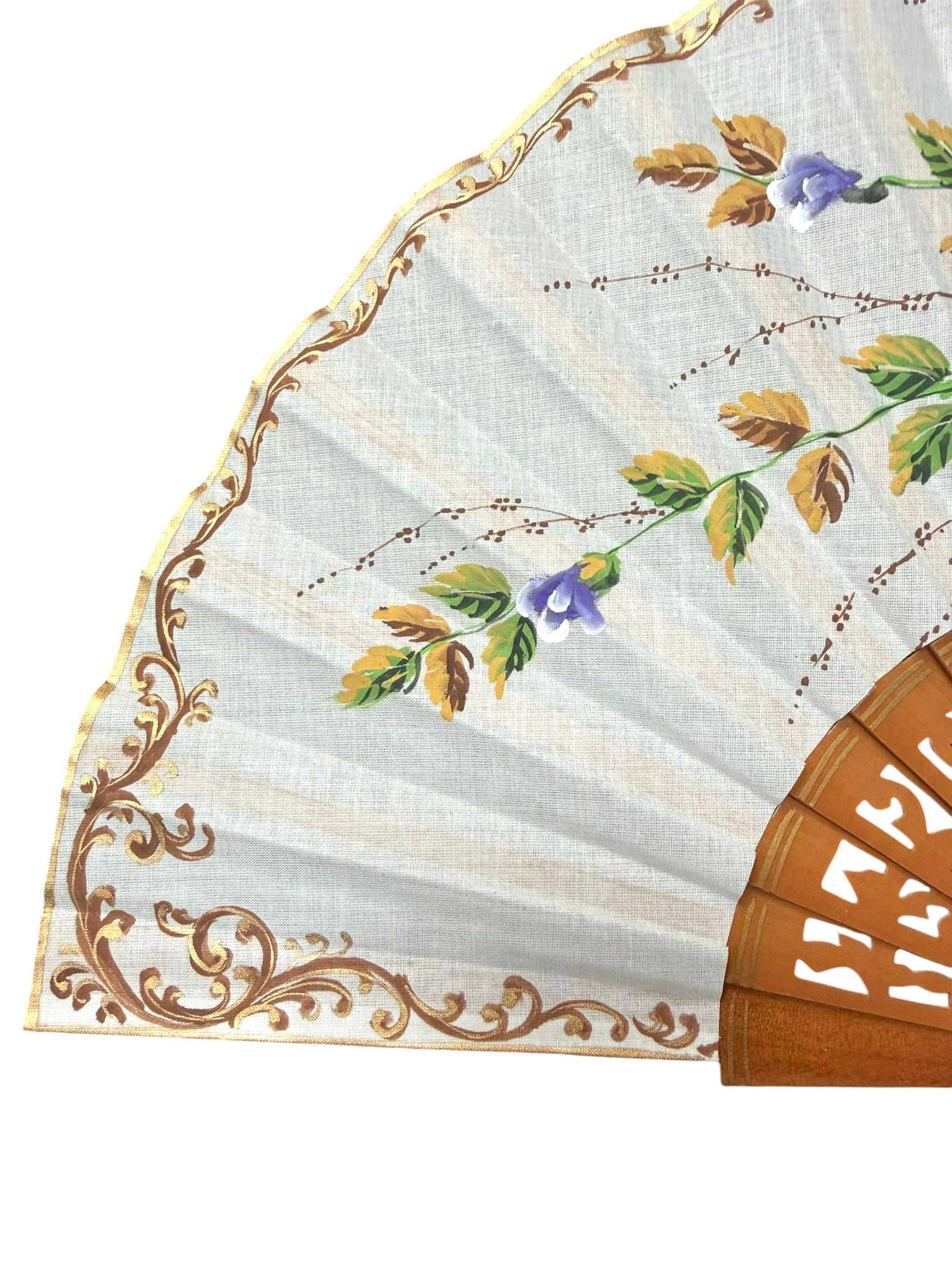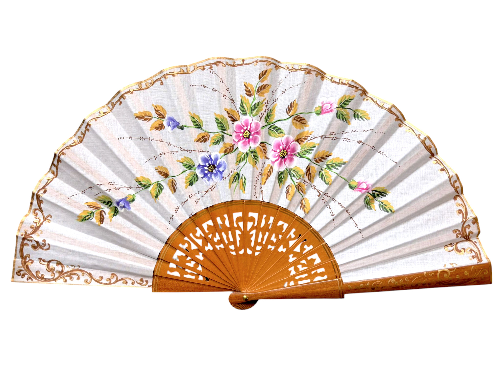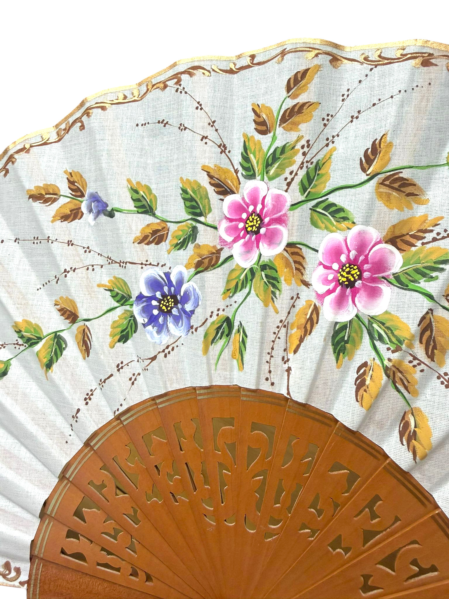 Abanico blanco con delicadas flores pintadas a mano en tonos rosa, azul y verde, acompañado de elegantes detalles ornamentales en color dorado. Un diseño fino y romántico, ideal para ocasiones especiales o para aportar un toque sofisticado a cualquier conjunto.