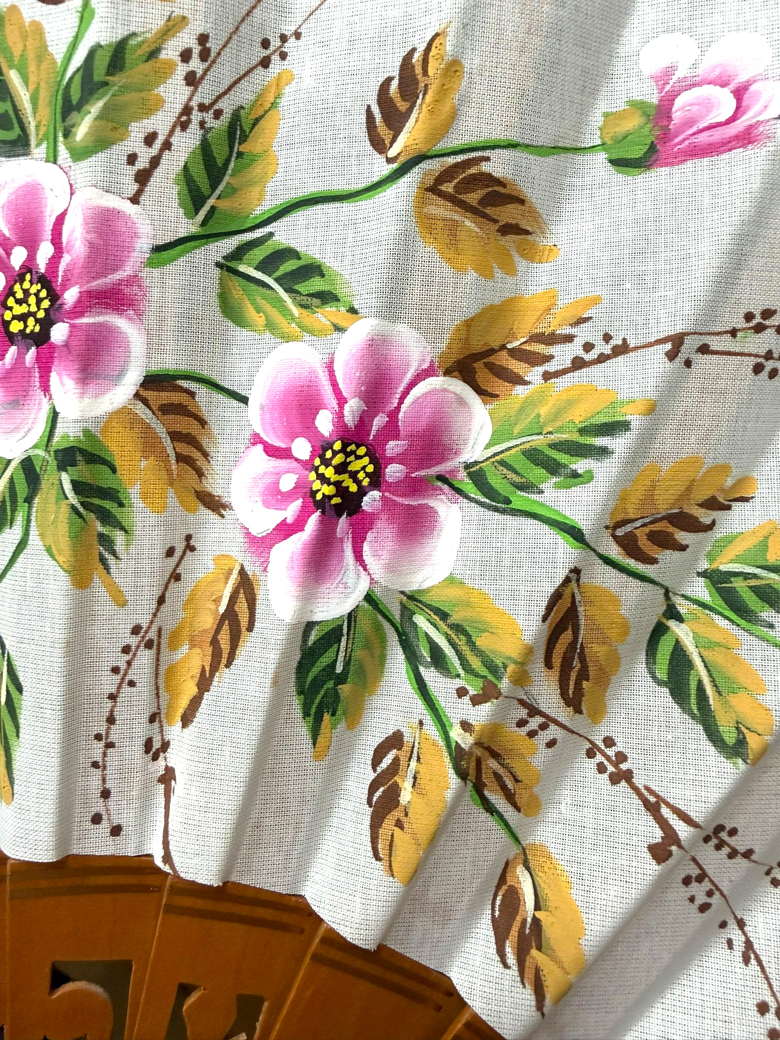 Abanico blanco pintado a mano con varilla calada de peral pulido. 45x25cm