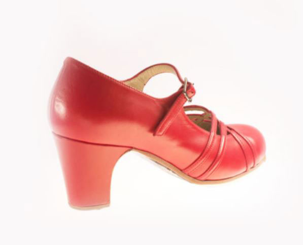 Flamenco dance shoes based on the traditional models salon and Correa, with four crossed straps from the edge of the sole and over the vamp, making a geometric crossed shape.