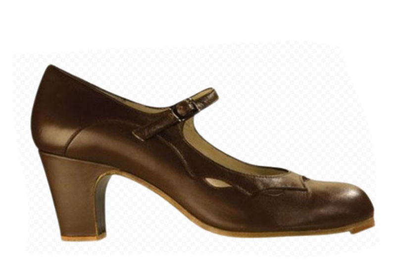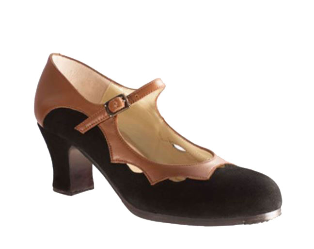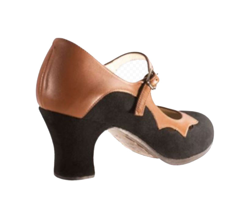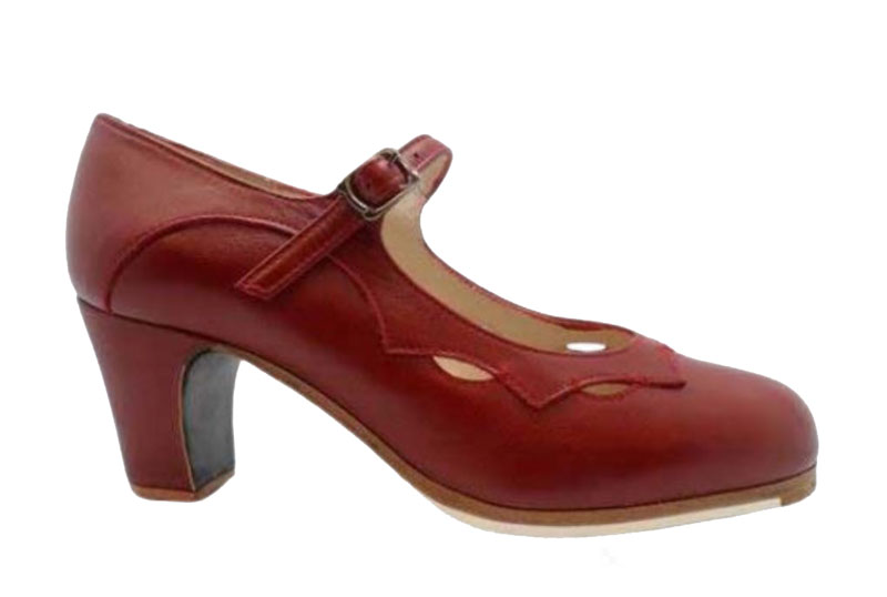 Zapato de baile flamenco Estrella basado en el modelo tradicional salón y correa, adornado desde el borde la suela sobre el empeine haciendo calados geométricos en forma de estrella. Tiene planta de cuero, filis con acabado antideslizante, suela y planta de cuero cosidos a mano, clavos en puntera y tacón y forro de piel.