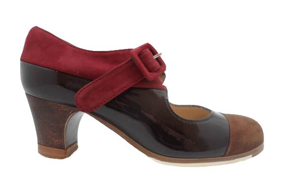 Zapato de baile flamenco con una hebilla al lado, de diseño muy original, ya que se fabrica con tres colores distintos. Tiene planta de cuero, filis con acabado antideslizante, suela y planta de cuero cosidos a mano, clavos en puntera y tacón y forro de piel.