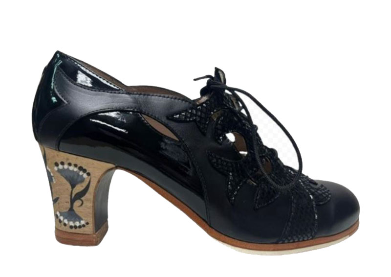 Zapato profesional para baile flamenco con planta de cuero, filis con acabado antideslizante, suela y planta de cuero cosidos a mano, clavos en puntera y tacón, y forro de piel. El tiempo de entrega aproximado una vez pagados los zapatos es de 60 días laborables.