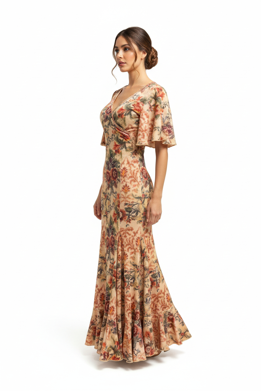 Long dress with crossover front neckline. Flared set-in sleeves. Godets on the sides and sides. Ruffles all around the hem.