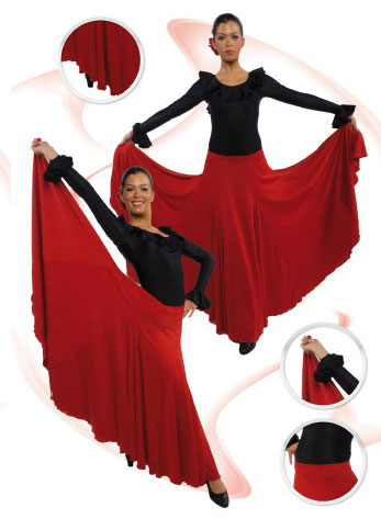 Falda para baile flamenco con nesgas y godets, que va entallada a media cadera y con vuelo de capa desde encima de la rodilla. Fabricada en España.