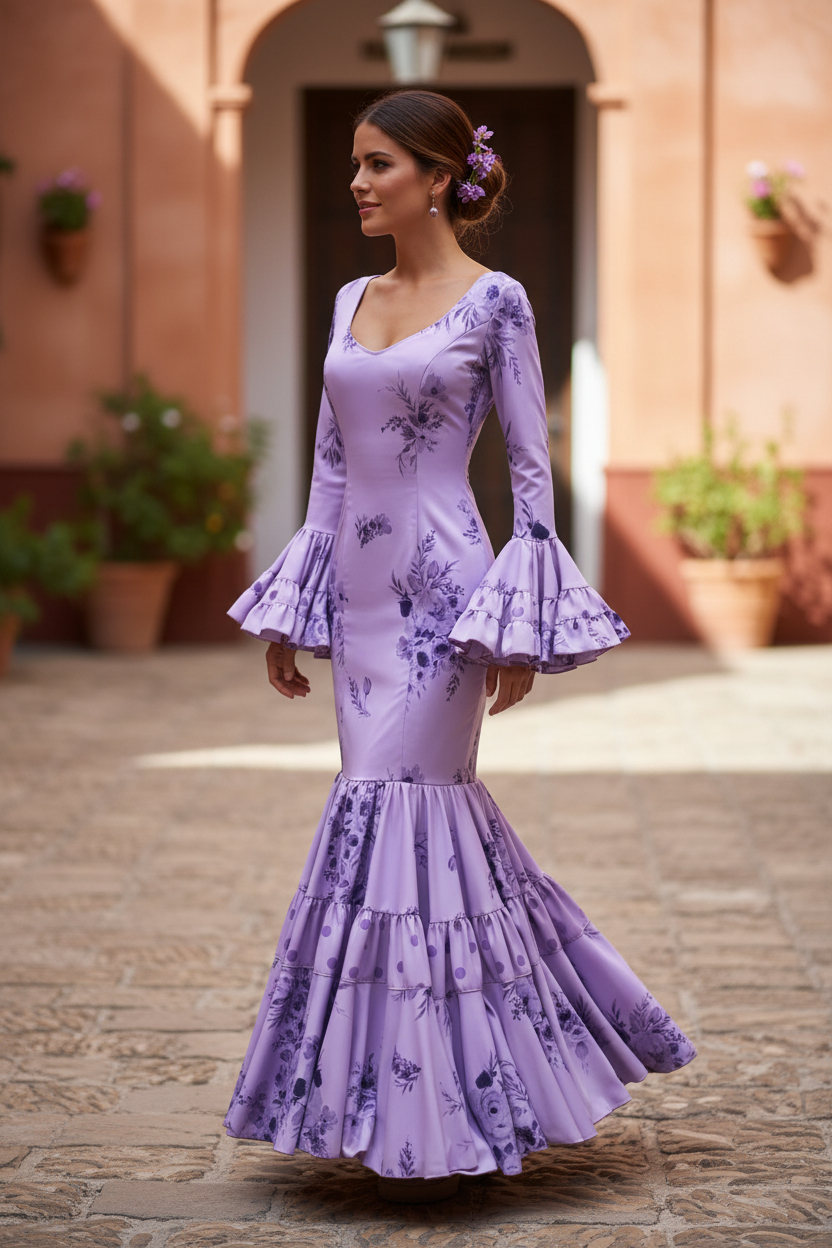 Available in different styles of flamenco dresses: classic, traditional, modern, and trendy. Designs with ruffles on skirts, sleeves, or bodices that provide movement, stage presence, and a flattering silhouette. Long fitted flamenco dresses, designed to enhance the female figure.