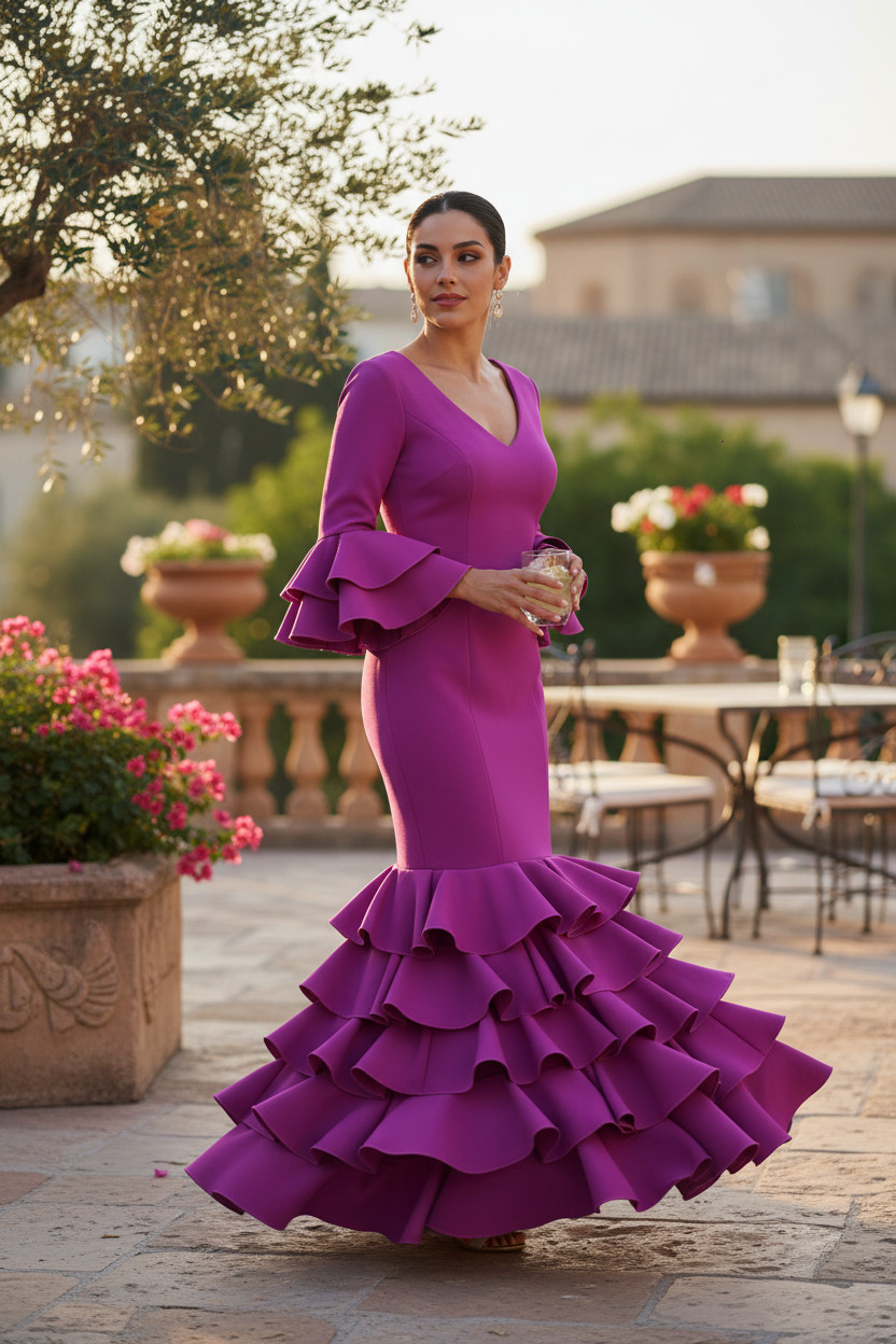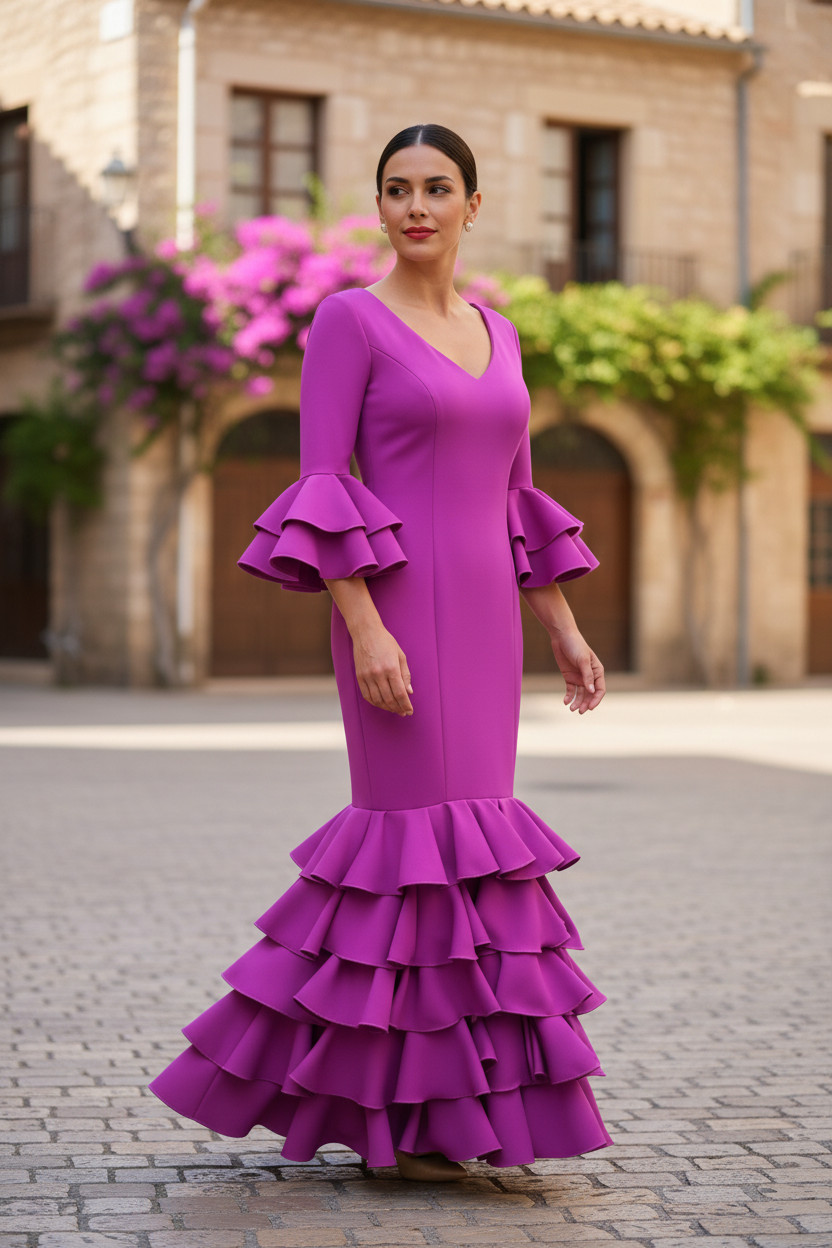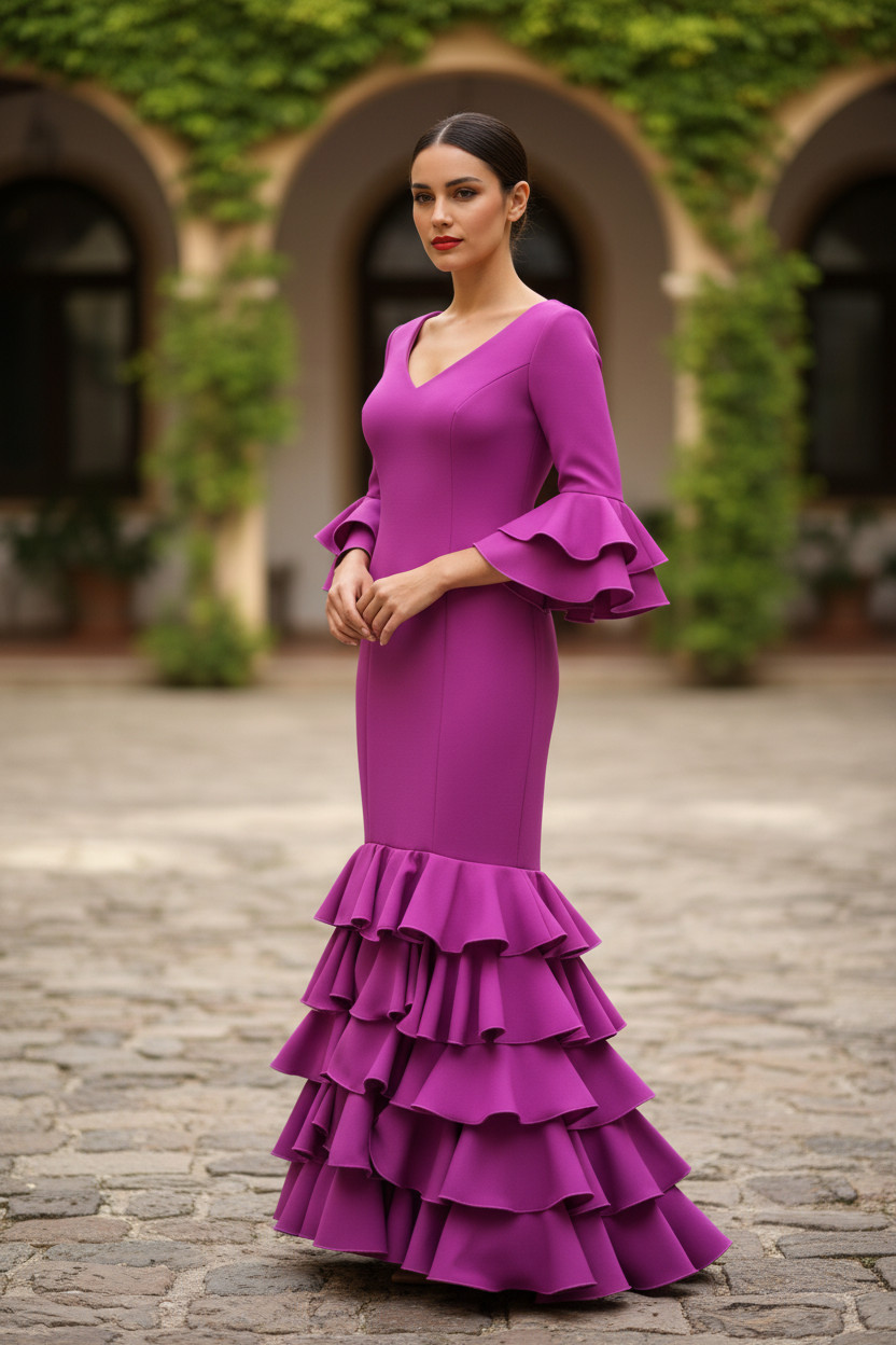 Flamencoexportでは、完璧な仕立てのフラメンコドレスを発見できます。無地の色でデザインされ、4月のフェアやスペイン全土の祝典であなたの美しさを引き立てるために作られています。