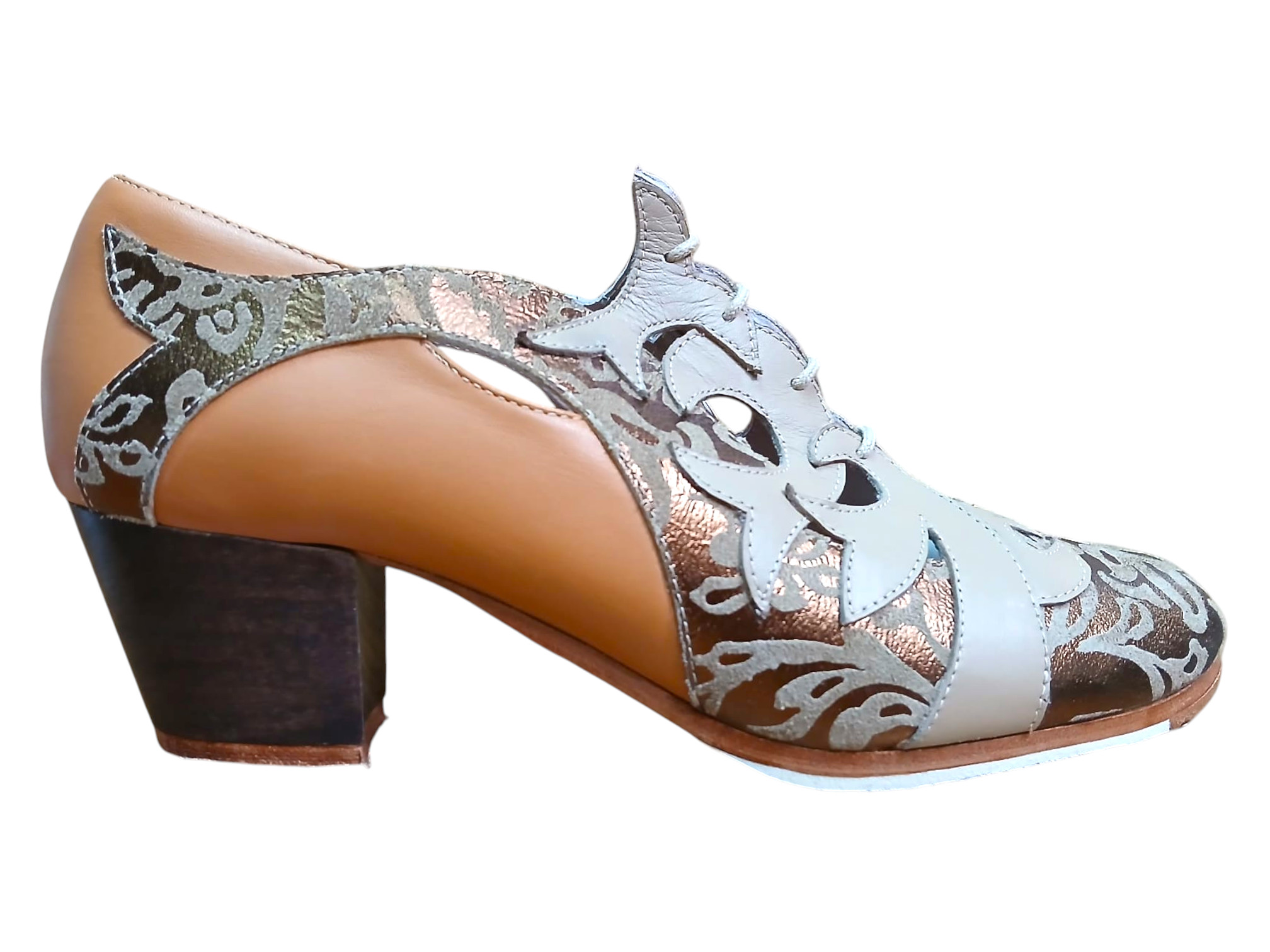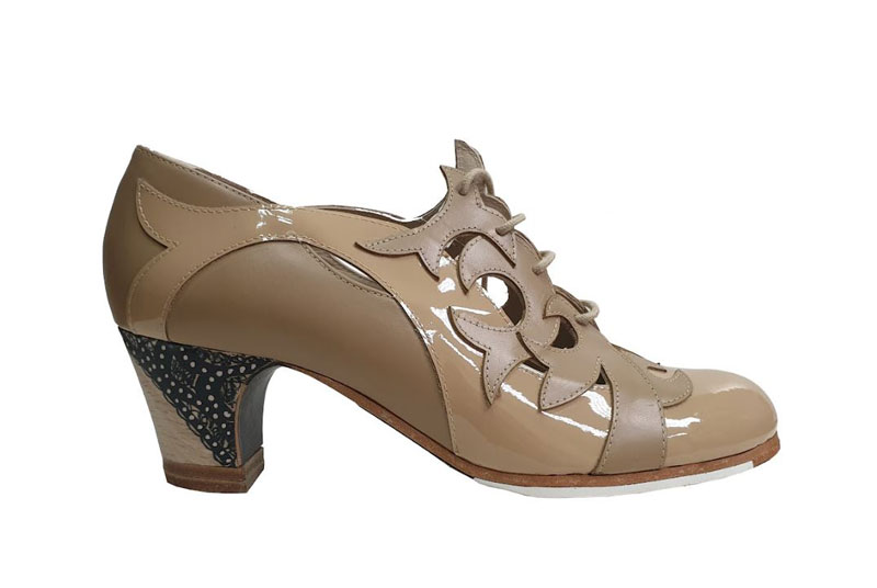 べゴ-ニャセルベラのオリジナルフラメンコシュ-ズ。"Cuentos de Azúcar"シュ-ズは特別にEva Yerbabuenaのフラメンコショ-用にデザインされた作品です。このプロフェッショナルフラメンコシュ-ズは皮革製ソール、滑り止め加工されたフィリス、手縫いによるソ-ル取り付け、つま先とかかと部分の釘の取り付け、レザ-製の裏地。