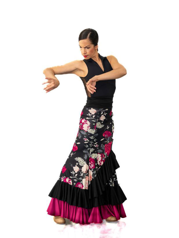 The Happy Dance flamenco skirt is a garment designed for dancers looking for quality and versatility in every movement. Made in Spain from the finest materials, this skirt features 4 fitted, mid-thigh length blades, a wide double waistband and a midi-flight design. The two ruffles, one at the hem and one at mid-thigh, create a stunning flounce effect, perfect for highlighting in dance classes or flamenco shows on stage.
