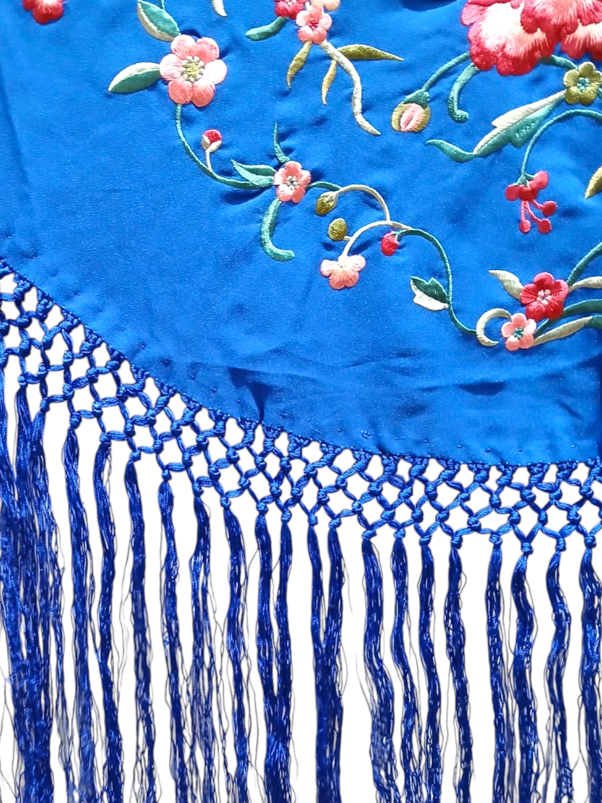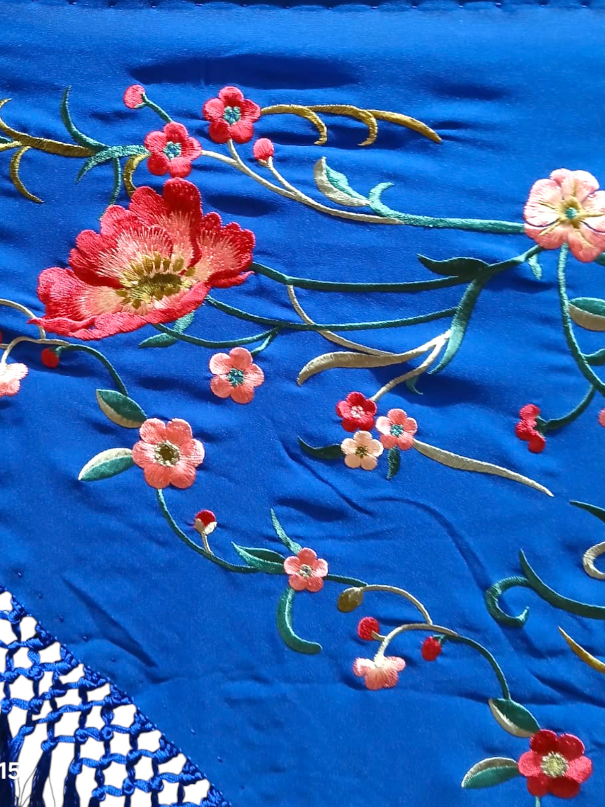 Este mantoncillo en tono azulón combina feminidad y sofisticación, perfecto para quienes buscan un toque único y actual. Sus bordados florales y los flecos en armonía con el color aportan movimiento y estilo al traje de flamenca. Un complemento versátil que destaca tanto de día como de noche en cualquier celebración andaluza.