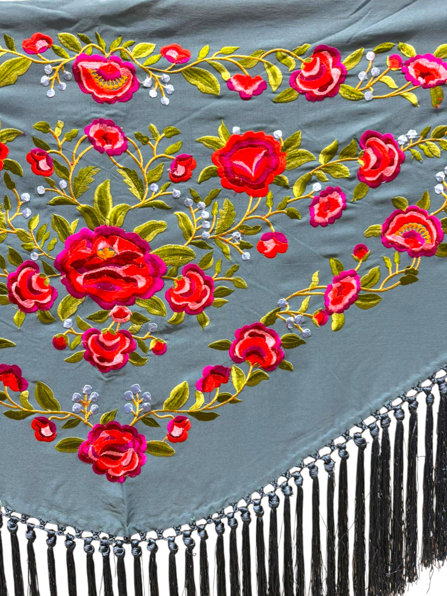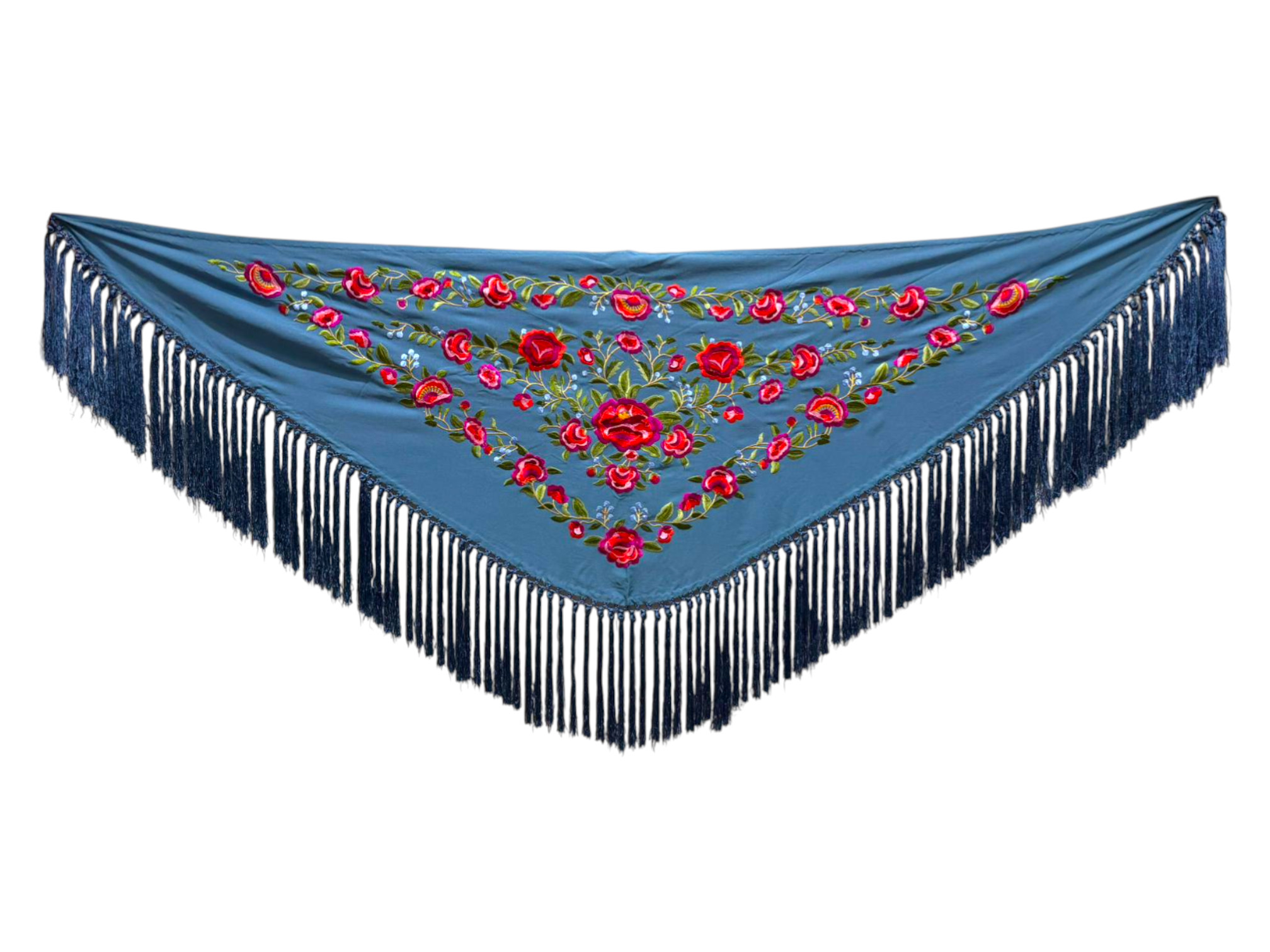 Está rematado con flecado de seda anudado a mano, que aporta movimiento, caída y un acabado tradicional de gran calidad. Fabricado íntegramente en España, es un mantoncillo económico, ideal tanto para feria, romerías, espectáculos o uso profesional.