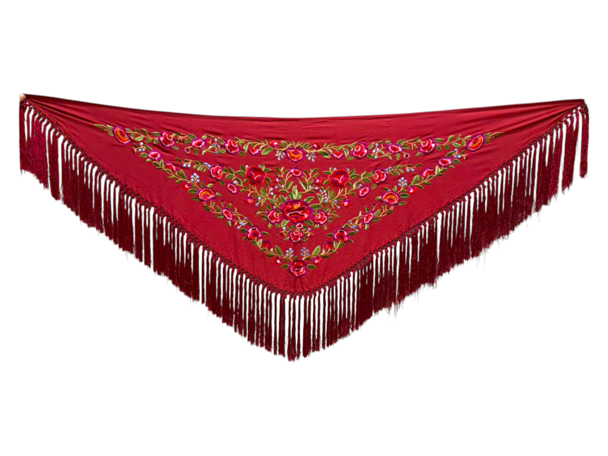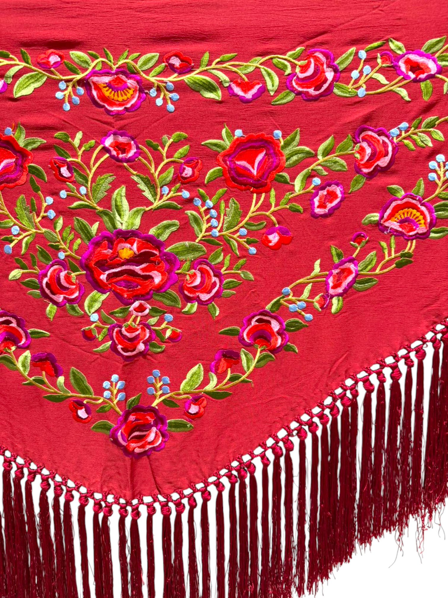 Está rematado con flecado de seda anudado a mano, que aporta movimiento, caída y un acabado tradicional de gran calidad. Fabricado íntegramente en España, es un mantoncillo económico, ideal tanto para feria, romerías, espectáculos o uso profesional.
