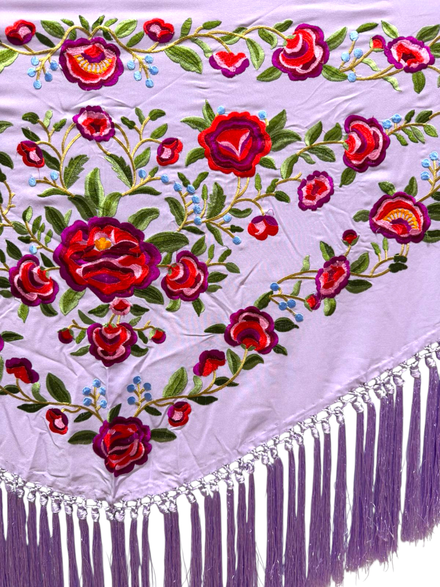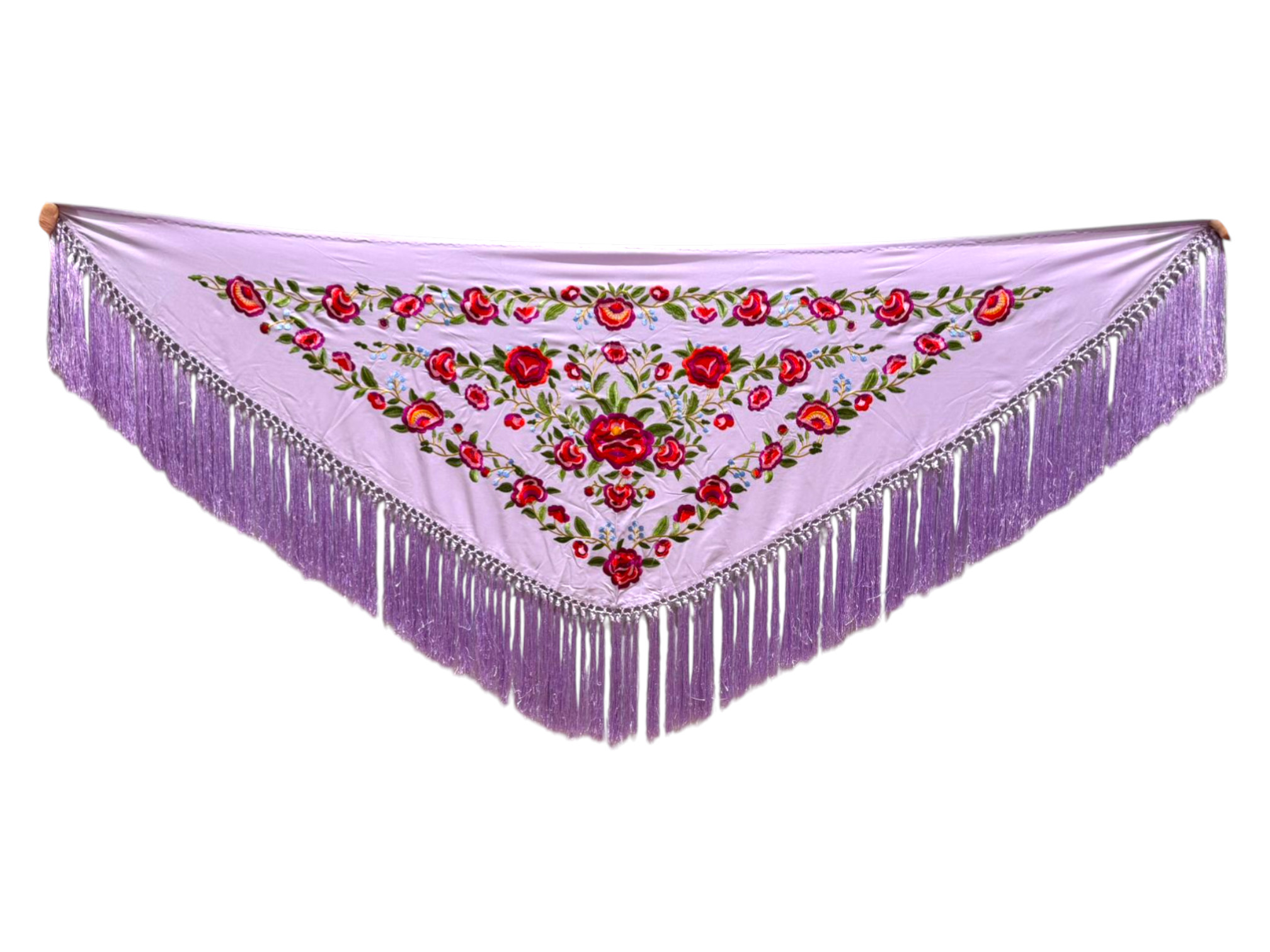 Está rematado con flecado de seda anudado a mano, que aporta movimiento, caída y un acabado tradicional de gran calidad. Fabricado íntegramente en España, es un mantoncillo económico, ideal tanto para feria, romerías, espectáculos o uso profesional.