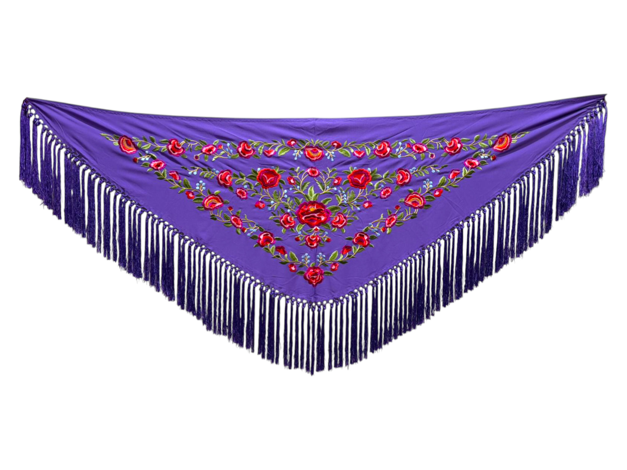 Está rematado con flecado de seda anudado a mano, que aporta movimiento, caída y un acabado tradicional de gran calidad. Fabricado íntegramente en España, es un mantoncillo económico, ideal tanto para feria, romerías, espectáculos o uso profesional.
