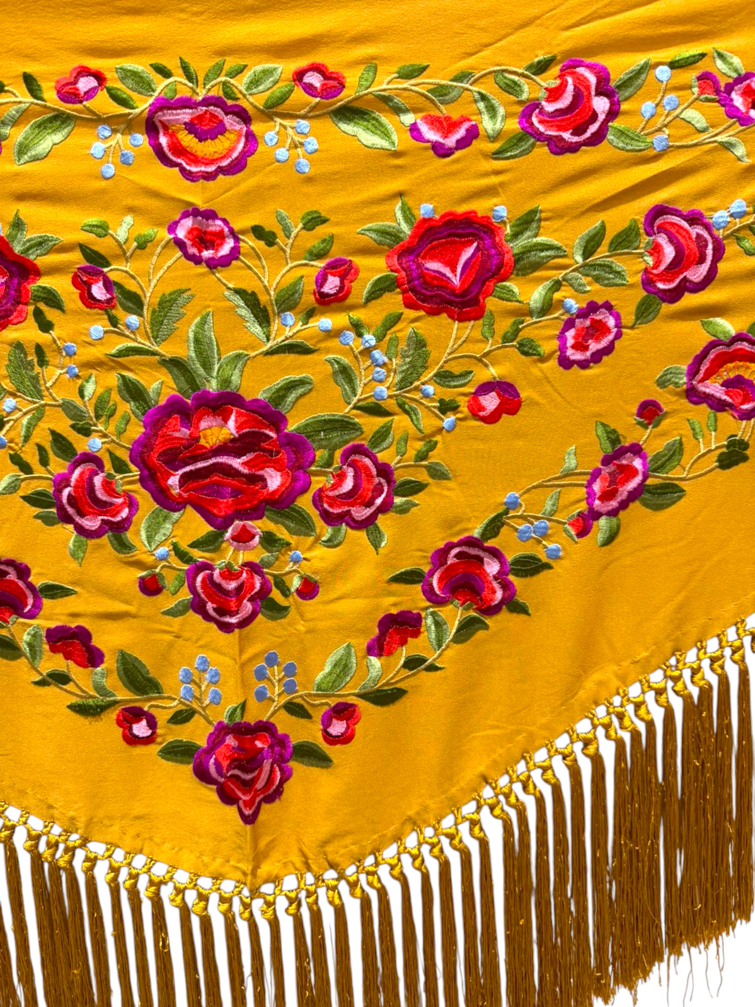 Está rematado con flecado de seda anudado a mano, que aporta movimiento, caída y un acabado tradicional de gran calidad. Fabricado íntegramente en España, es un mantoncillo económico, ideal tanto para feria, romerías, espectáculos o uso profesional.