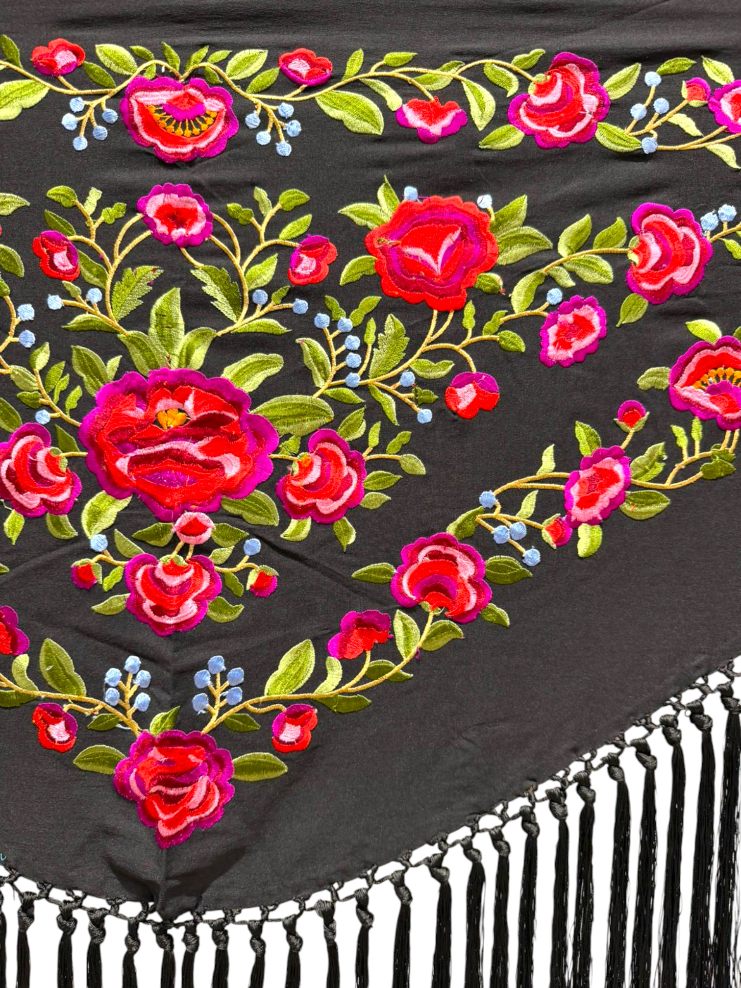 Está rematado con flecado de seda anudado a mano, que aporta movimiento, caída y un acabado tradicional de gran calidad. Fabricado íntegramente en España, es un mantoncillo económico, ideal tanto para feria, romerías, espectáculos o uso profesional.