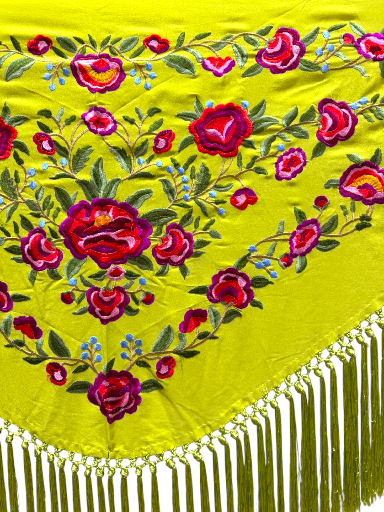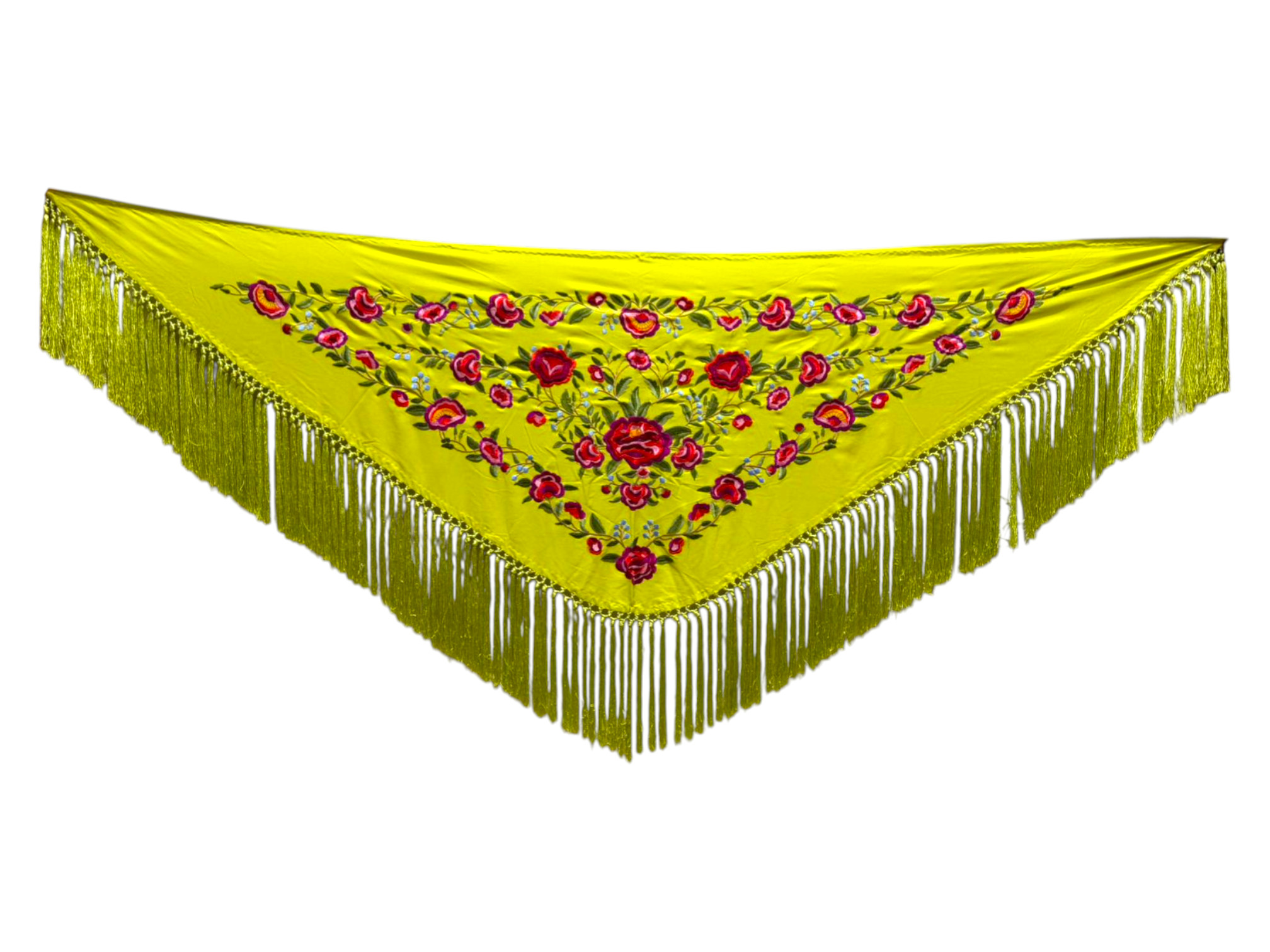 Está rematado con flecado de seda anudado a mano, que aporta movimiento, caída y un acabado tradicional de gran calidad. Fabricado íntegramente en España, es un mantoncillo económico, ideal tanto para feria, romerías, espectáculos o uso profesional.
