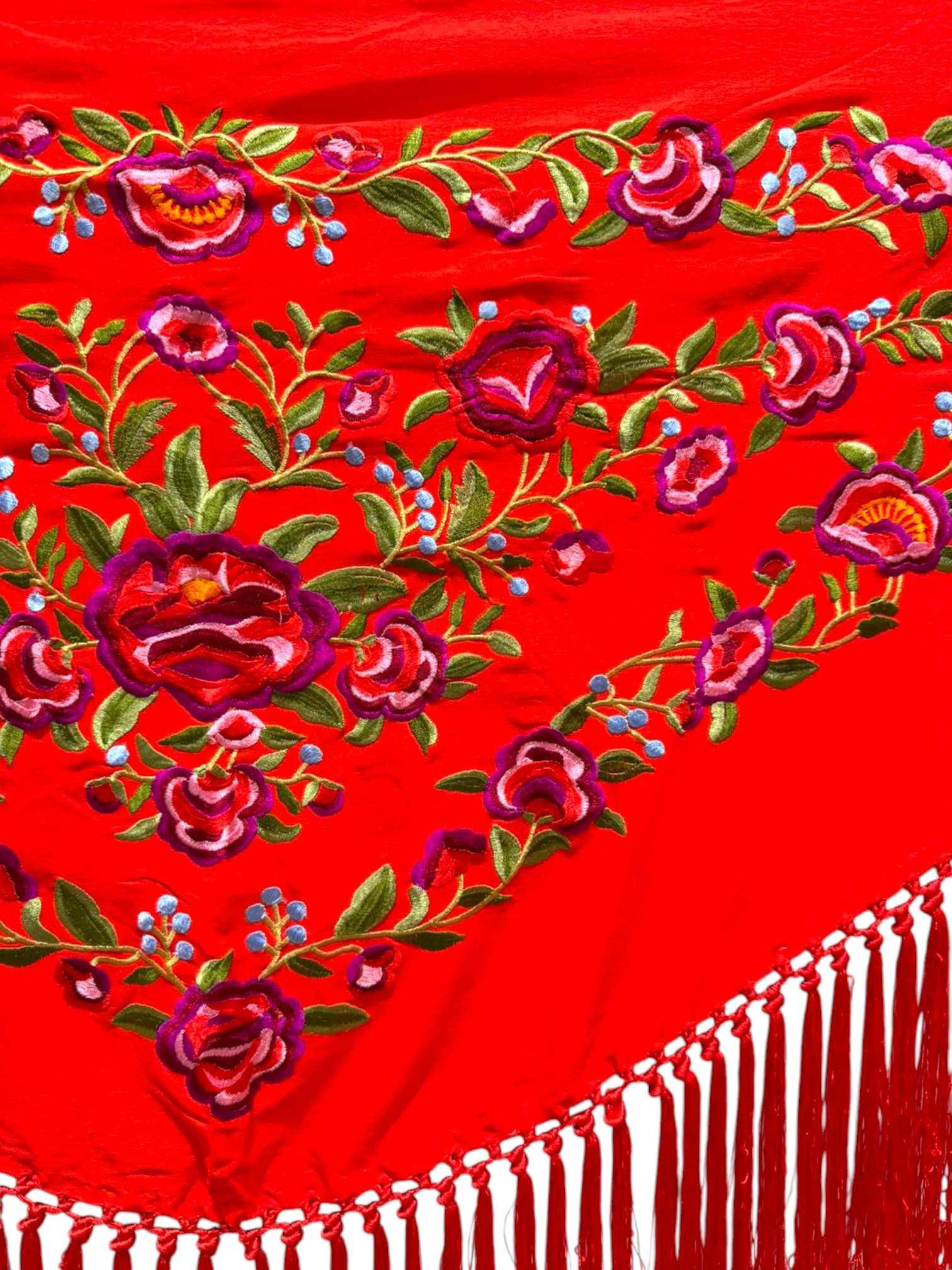 Está rematado con flecado de seda anudado a mano, que aporta movimiento, caída y un acabado tradicional de gran calidad. Fabricado íntegramente en España, es un mantoncillo económico, ideal tanto para feria, romerías, espectáculos o uso profesional.