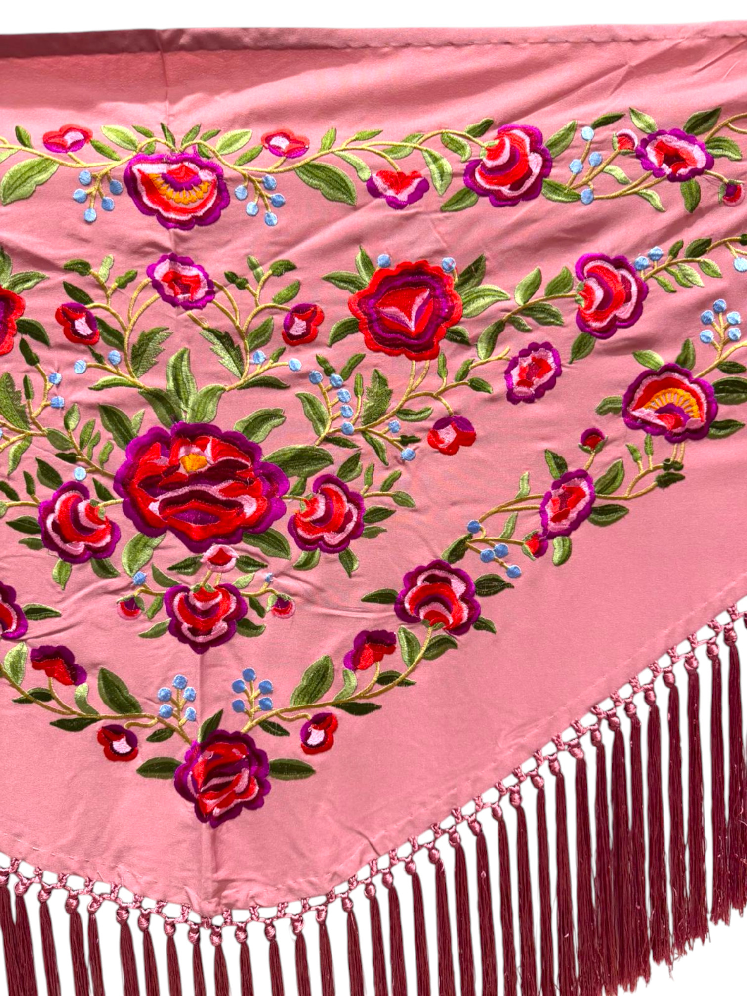 Está rematado con flecado de seda anudado a mano, que aporta movimiento, caída y un acabado tradicional de gran calidad. Fabricado íntegramente en España, es un mantoncillo económico, ideal tanto para feria, romerías, espectáculos o uso profesional.