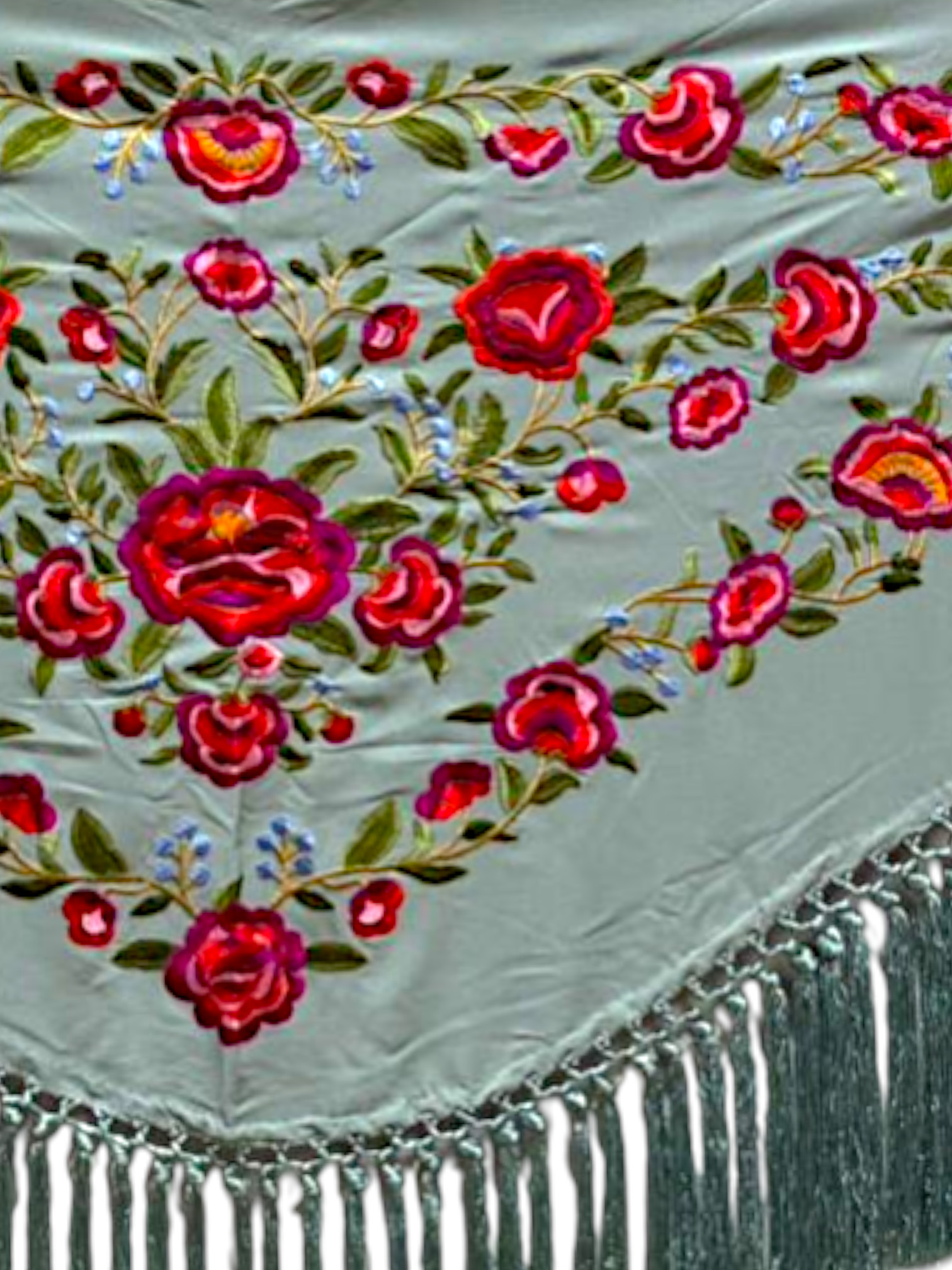 Mantoncillo de flamenca modelo Peonía, bordado a máquina con un delicado diseño floral de inspiración clásica. El bordado es siempre el mismo que el mostrado en la imagen; lo que varía es el color de la tela base, disponible en una amplia gama de tonos para adaptarse a cualquier traje de flamenca o estilismo.