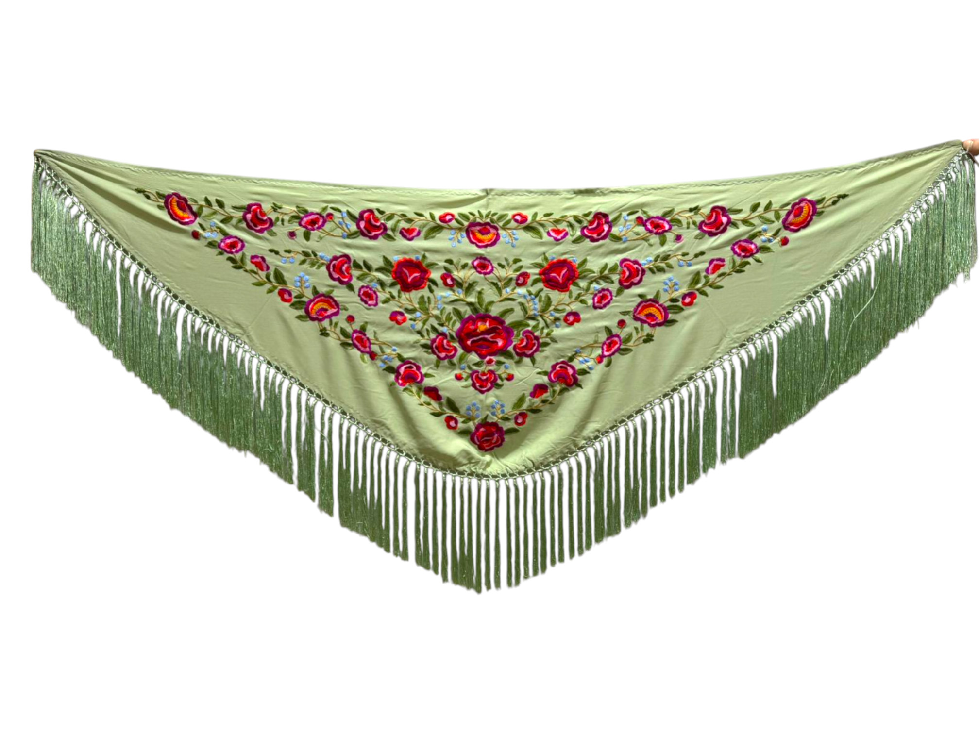 Está rematado con flecado de seda anudado a mano, que aporta movimiento, caída y un acabado tradicional de gran calidad. Fabricado íntegramente en España, es un mantoncillo económico, ideal tanto para feria, romerías, espectáculos o uso profesional.