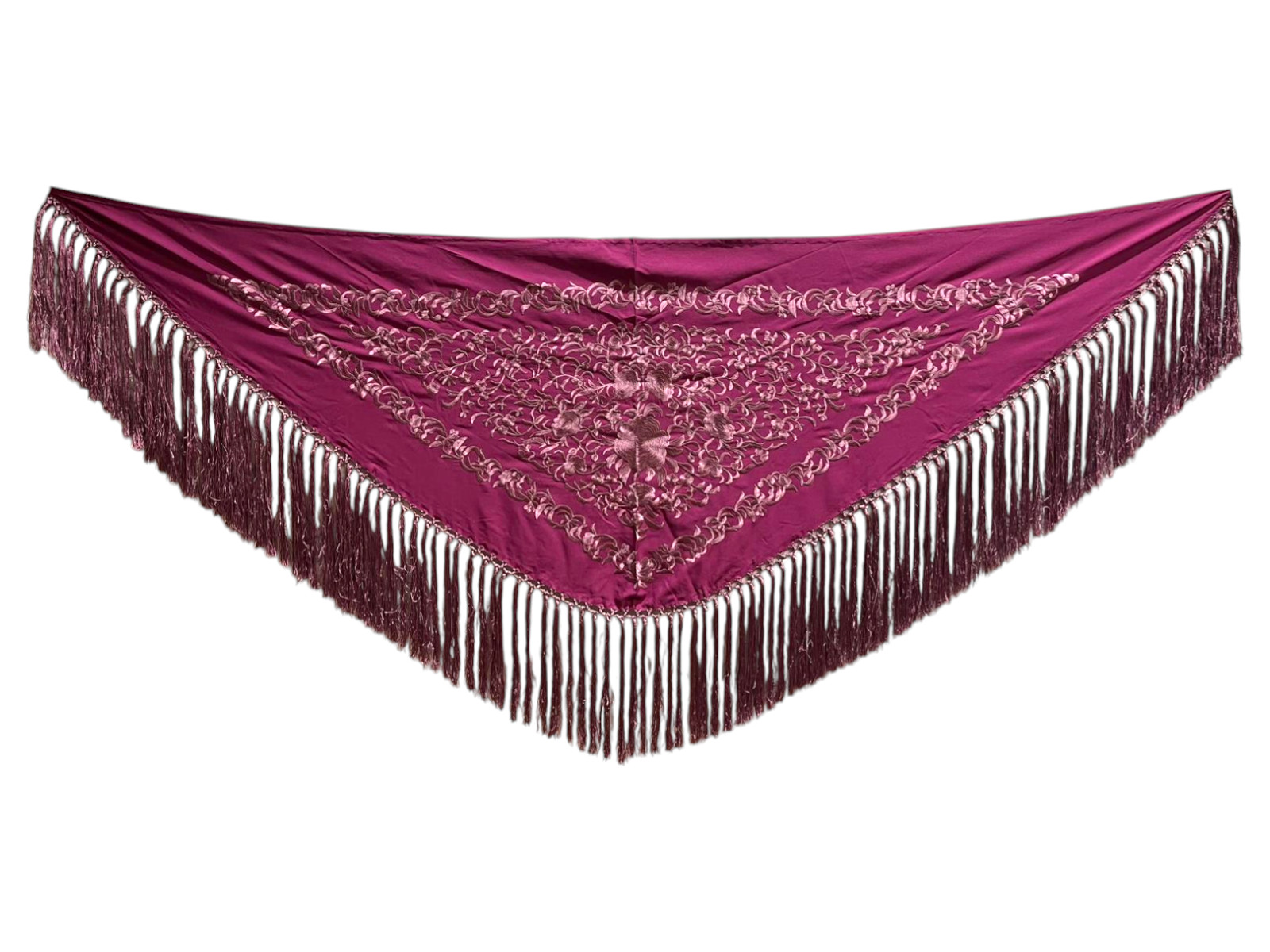 Está rematado con flecado de seda anudado a mano, que aporta movimiento, caída y un acabado tradicional de gran calidad. Fabricado íntegramente en España, es un mantoncillo económico que mantiene la esencia del complemento flamenco clásico.