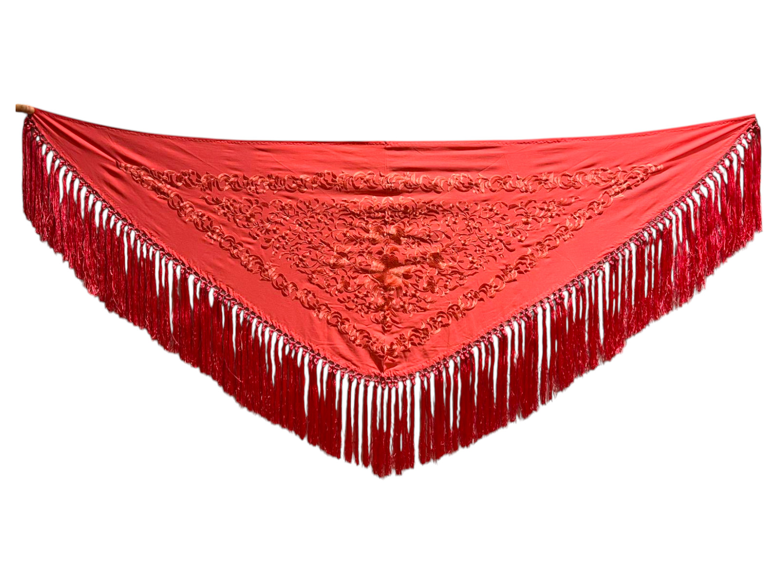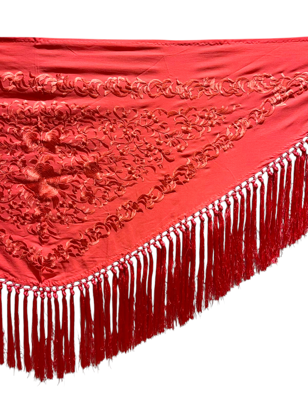Está rematado con flecado de seda anudado a mano, que aporta movimiento, caída y un acabado tradicional de gran calidad. Fabricado íntegramente en España, es un mantoncillo económico que mantiene la esencia del complemento flamenco clásico.