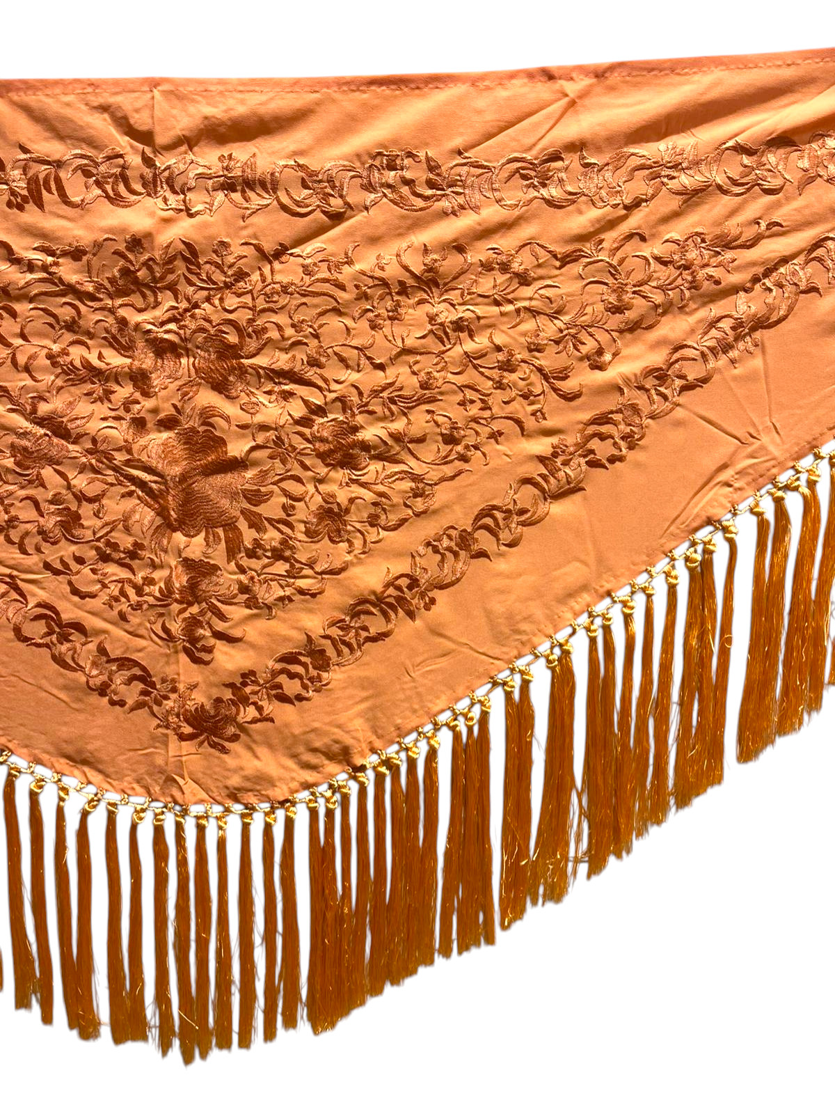 Está rematado con flecado de seda anudado a mano, que aporta movimiento, caída y un acabado tradicional de gran calidad. Fabricado íntegramente en España, es un mantoncillo económico que mantiene la esencia del complemento flamenco clásico.