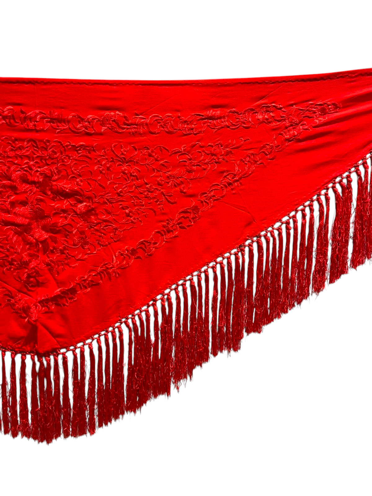 Está rematado con flecado de seda anudado a mano, que aporta movimiento, caída y un acabado tradicional de gran calidad. Fabricado íntegramente en España, es un mantoncillo económico que mantiene la esencia del complemento flamenco clásico.