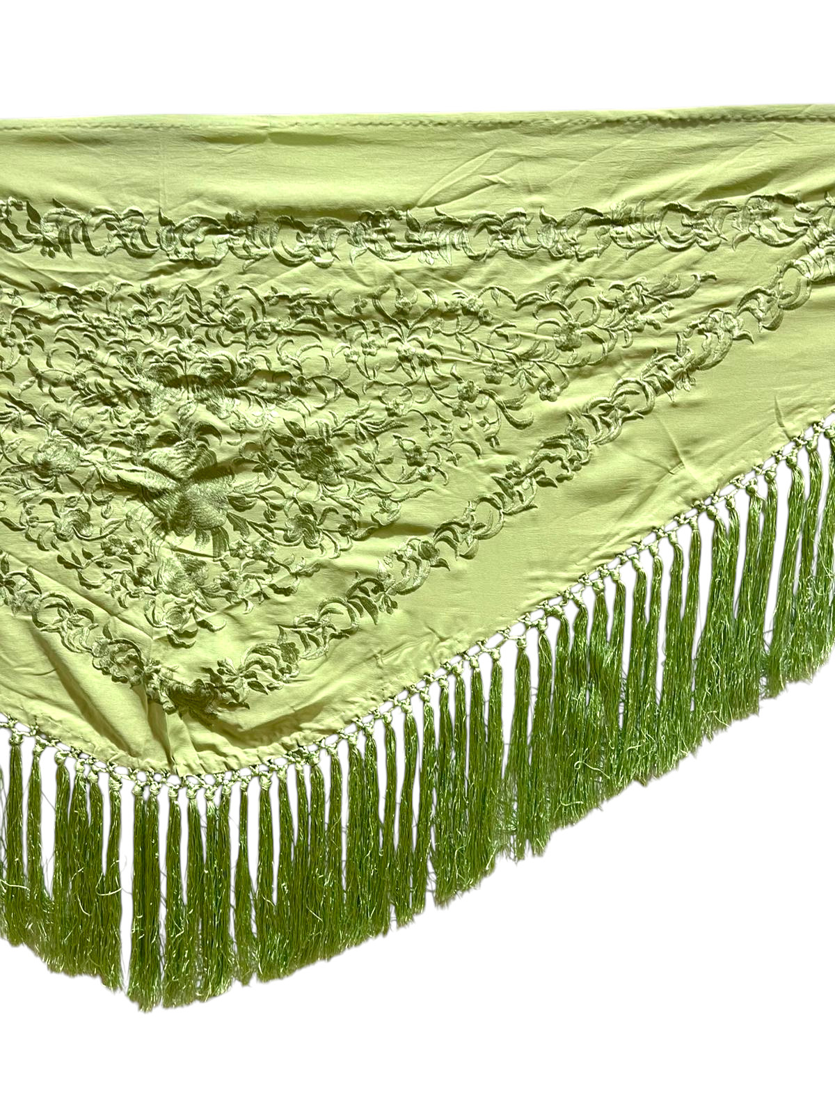 Está rematado con flecado de seda anudado a mano, que aporta movimiento, caída y un acabado tradicional de gran calidad. Fabricado íntegramente en España, es un mantoncillo económico que mantiene la esencia del complemento flamenco clásico.